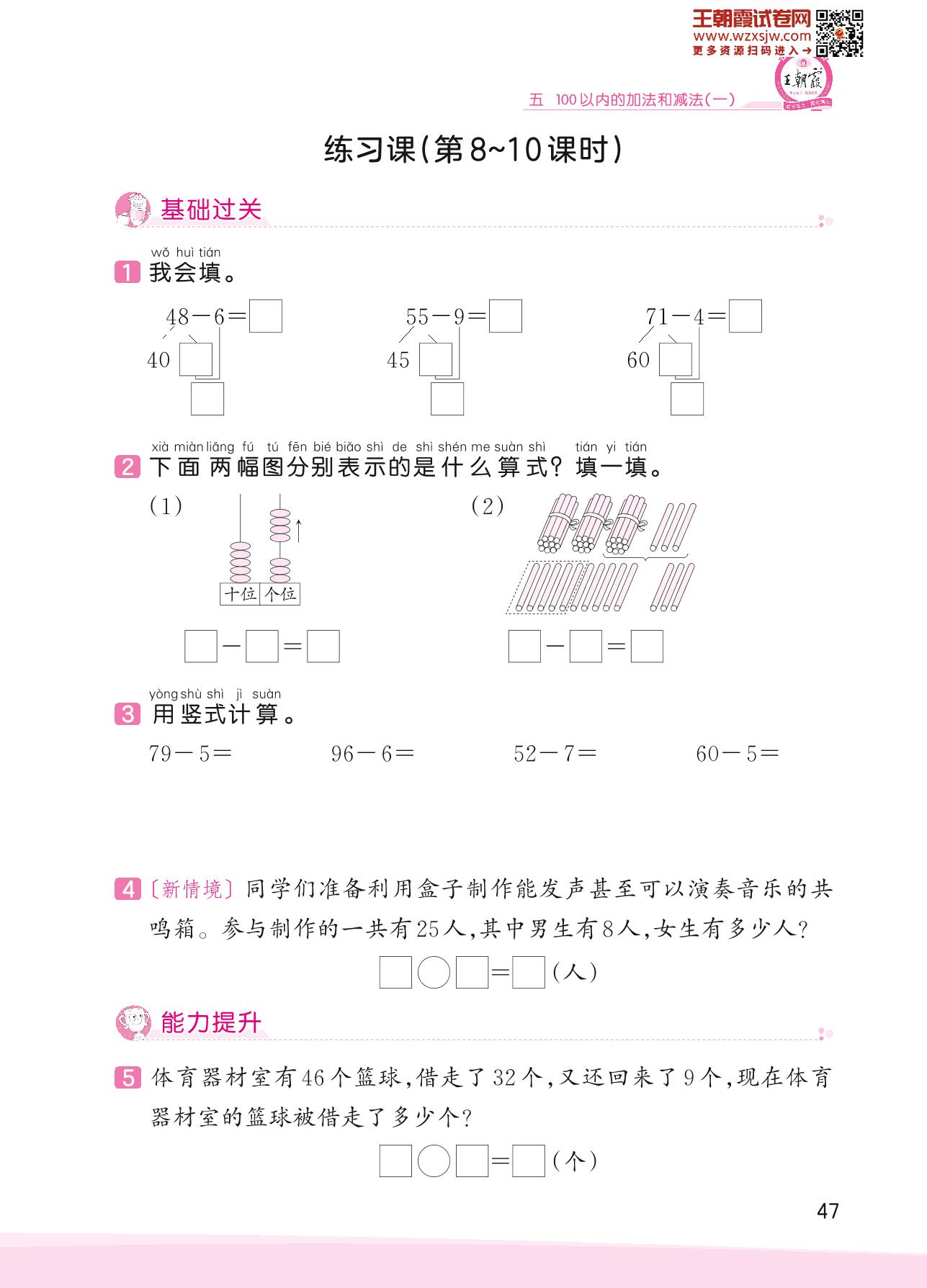 2023下册一年级数学冀教版 五 100以内的加法和减法(一)——练习课(第8~10课时)