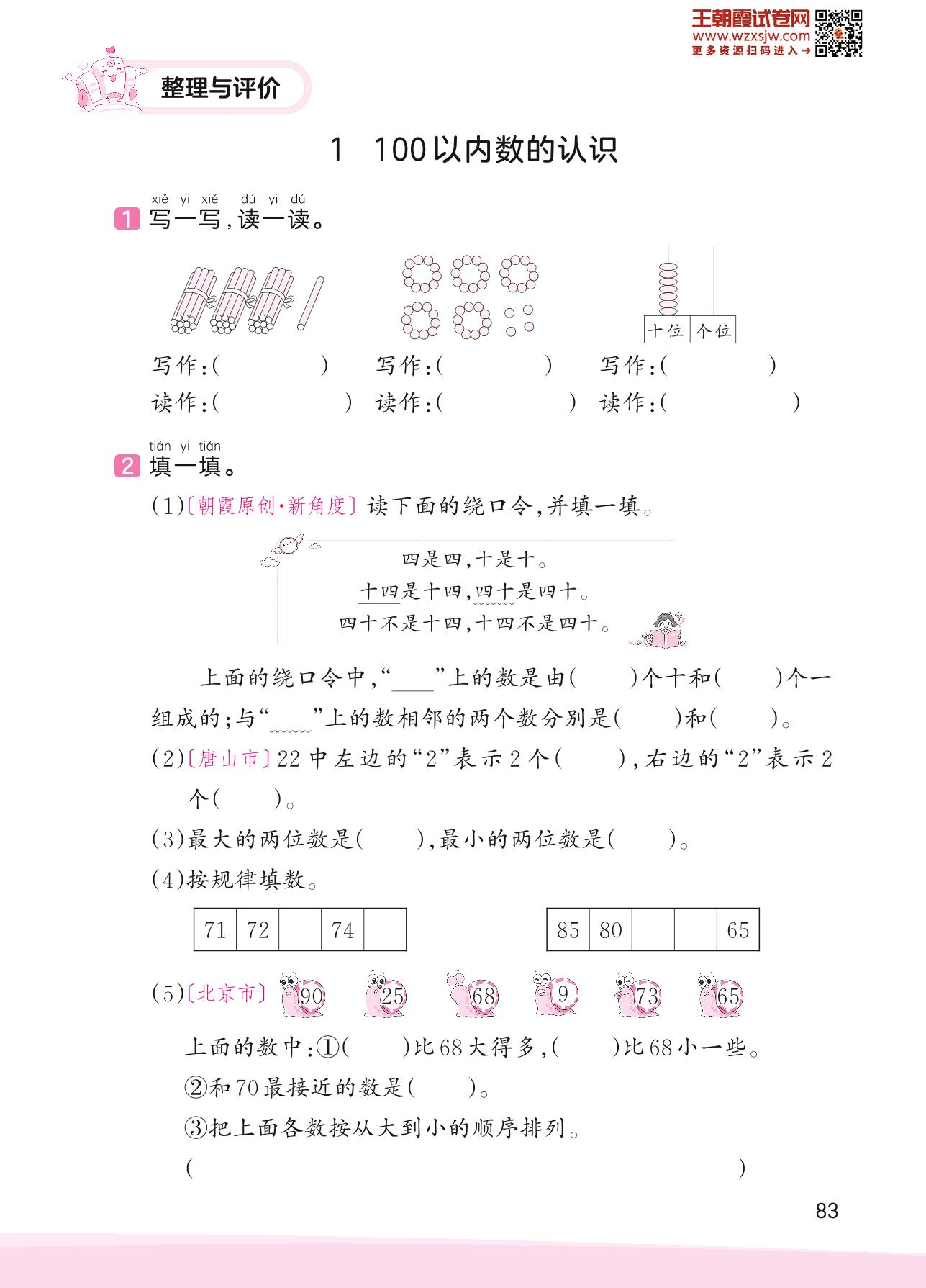 2023下册一年级数学冀教版 整理与评价——1 100以内数的认识
