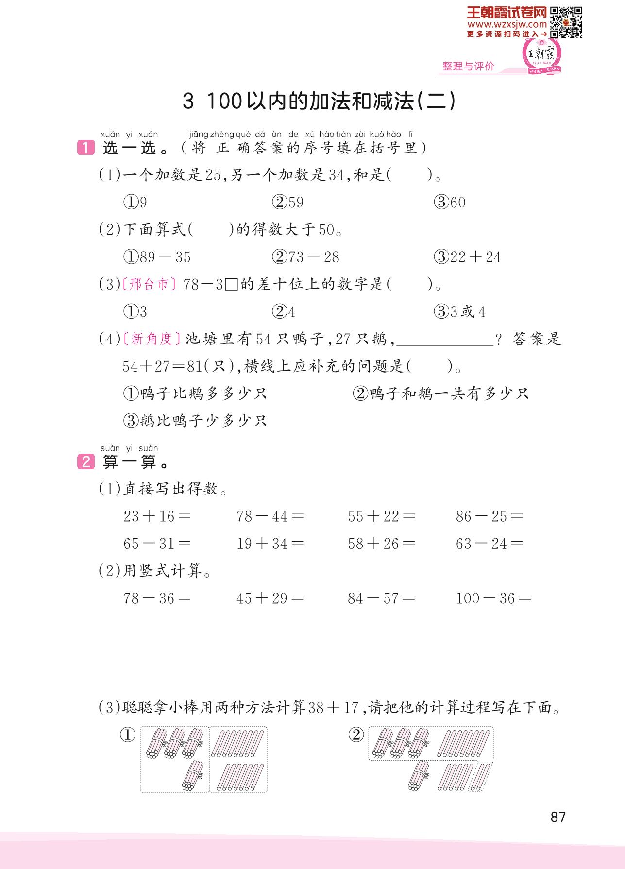 2023下册一年级数学冀教版 整理与评价——3 100以内的加法和减法(二)