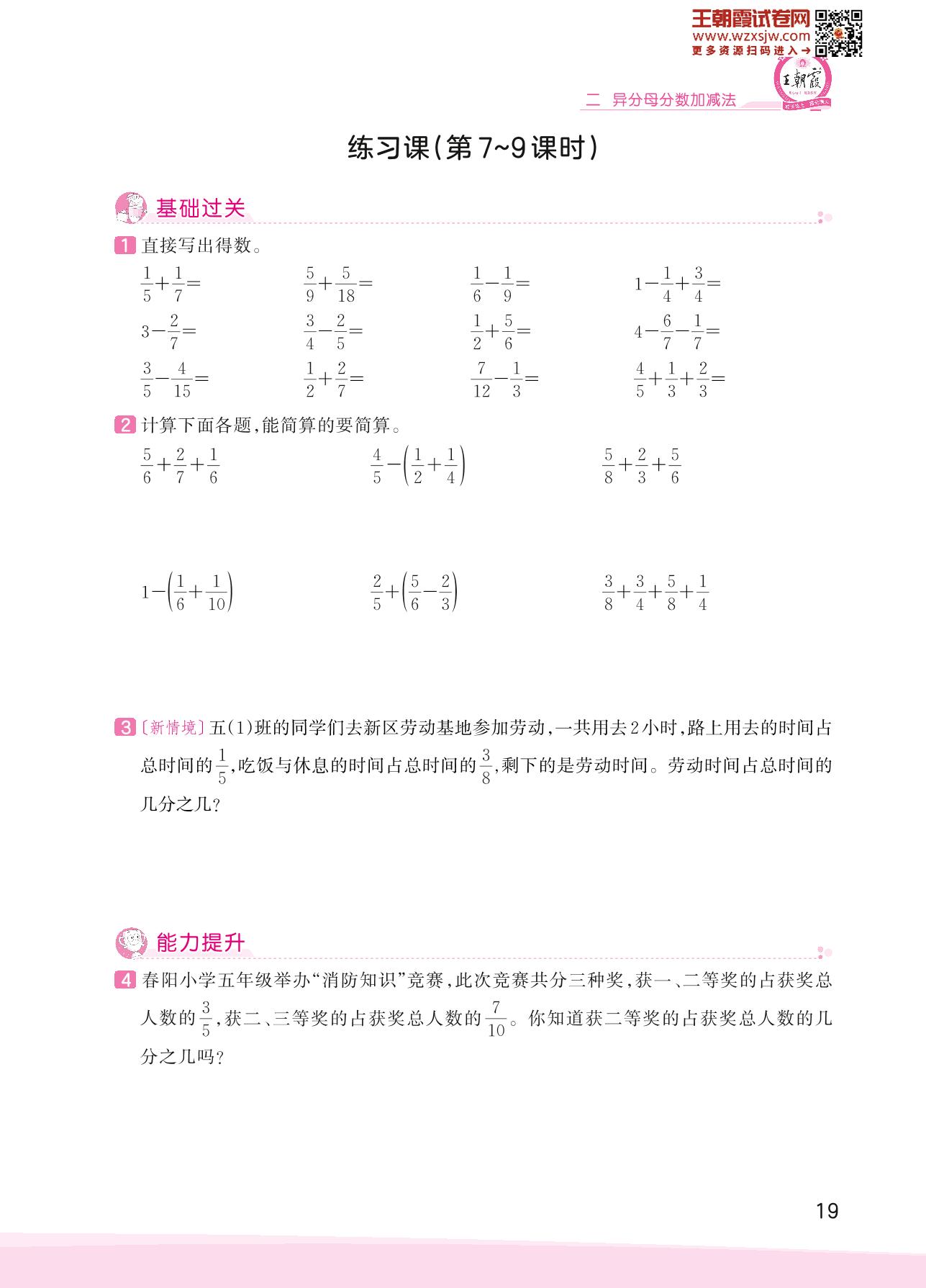 2023下册五年级数学冀教版 二 异分母分数加减法——练习课(第7~9课时)