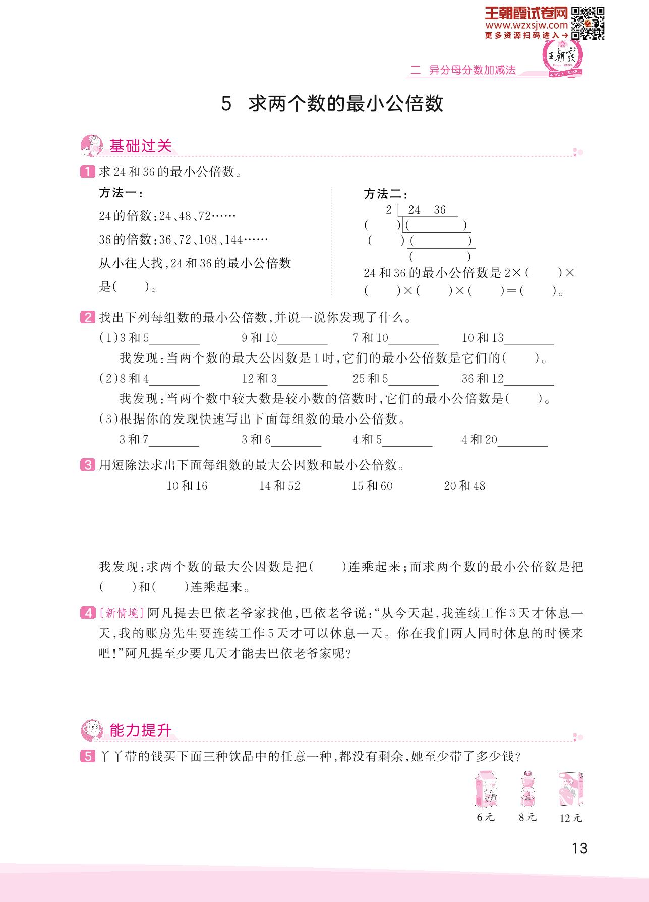 2023下册五年级数学冀教版 二 异分母分数加减法——5 求两个数的最小公倍数