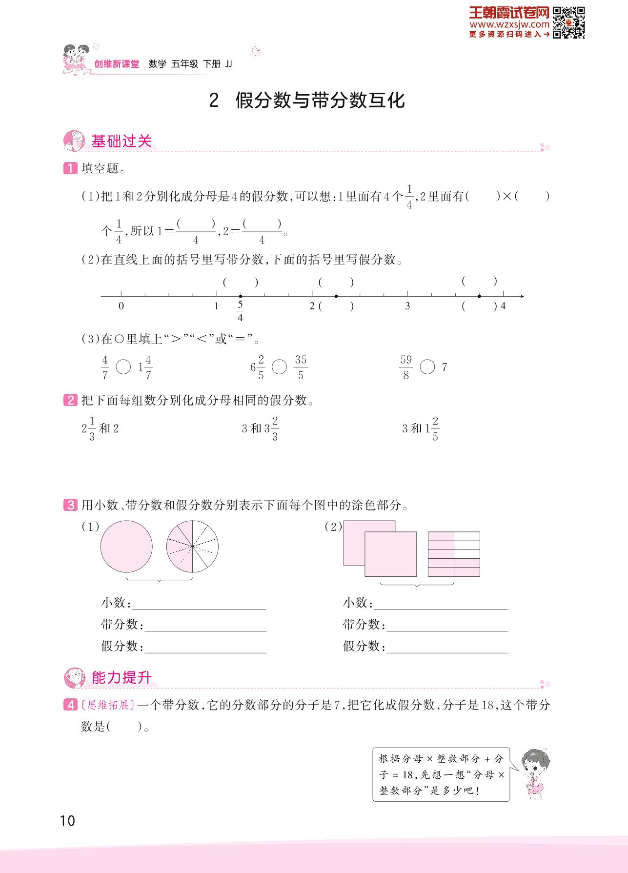 2023下册五年级数学冀教版 二 异分母分数加减法——2 假分数与带分数互化
