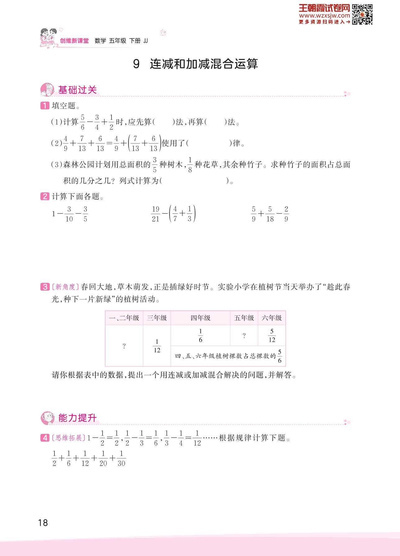 2023下册五年级数学冀教版 二 异分母分数加减法——9 连减和加减混合运算