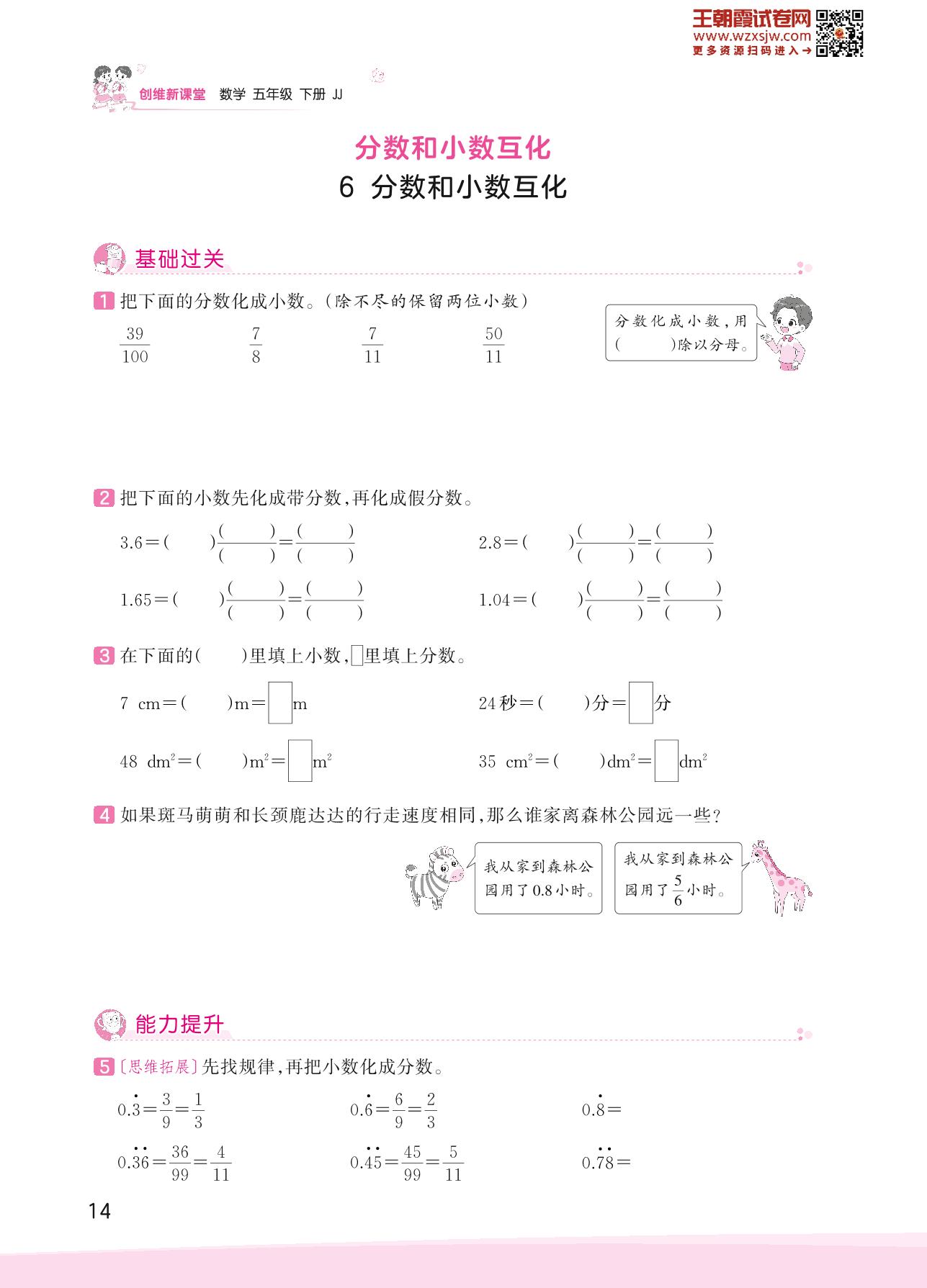 2023下册五年级数学冀教版 二 异分母分数加减法——6 分数和小数互化