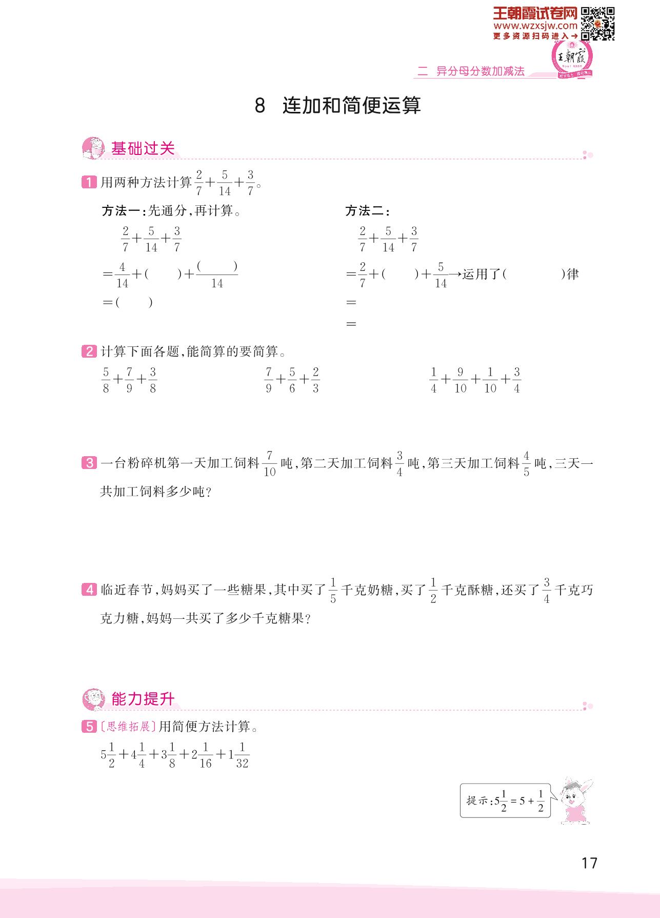 2023下册五年级数学冀教版 二 异分母分数加减法——8 连加和简便运算