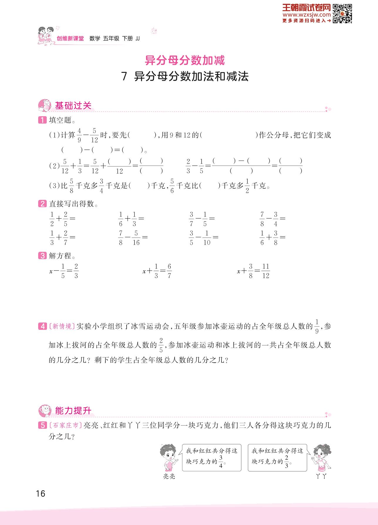 2023下册五年级数学冀教版 二 异分母分数加减法——7 异分母分数加法和减法