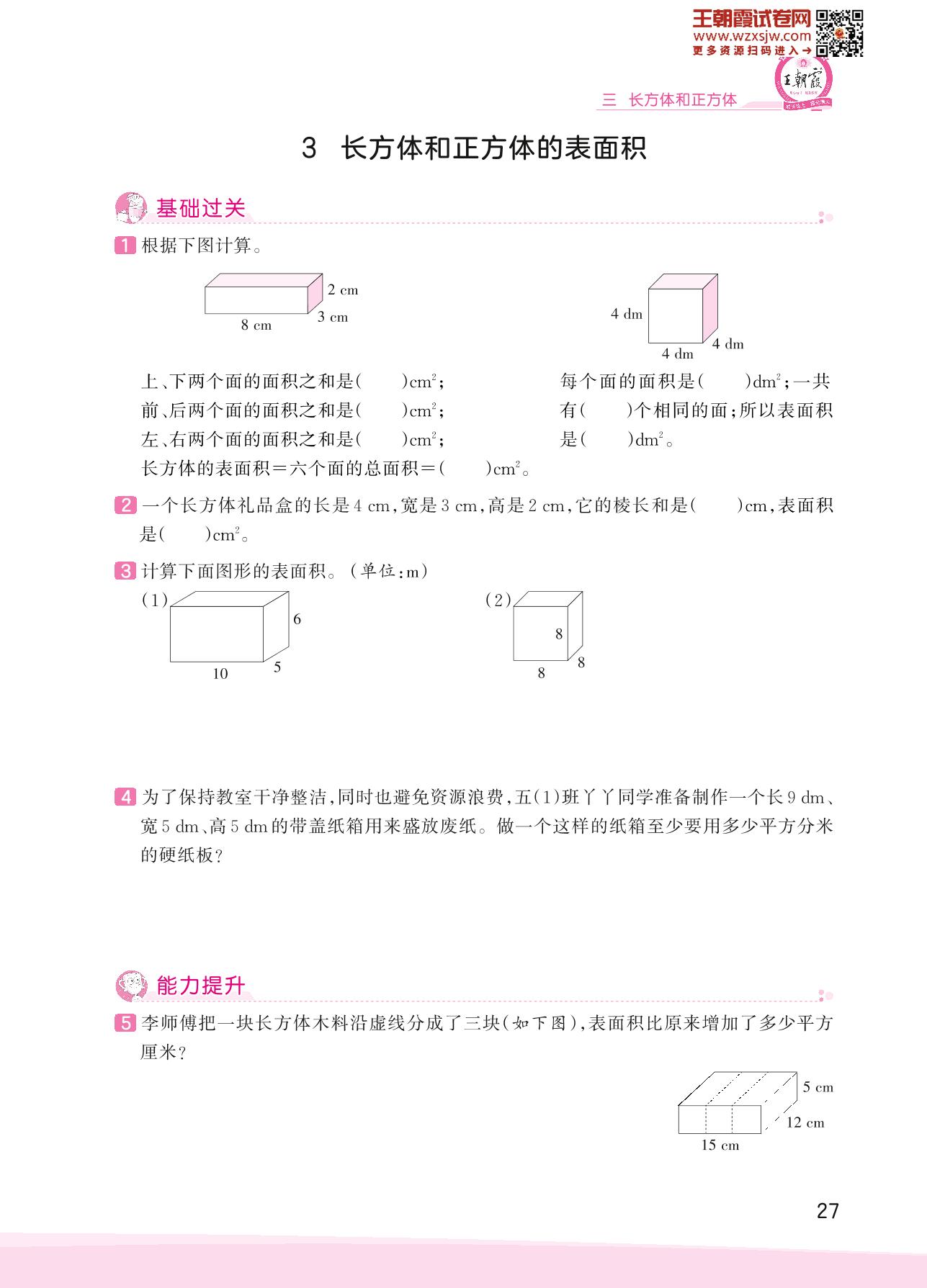 2023下册五年级数学冀教版 三 长方体和正方体——3 长方体和正方体的表面积