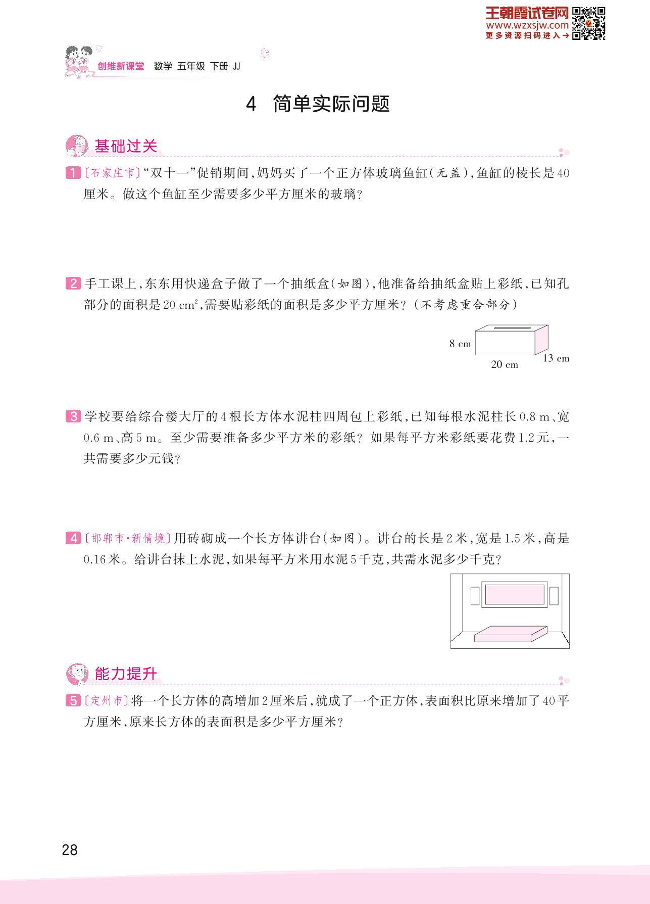 2023下册五年级数学冀教版 三 长方体和正方体——4 简单实际问题