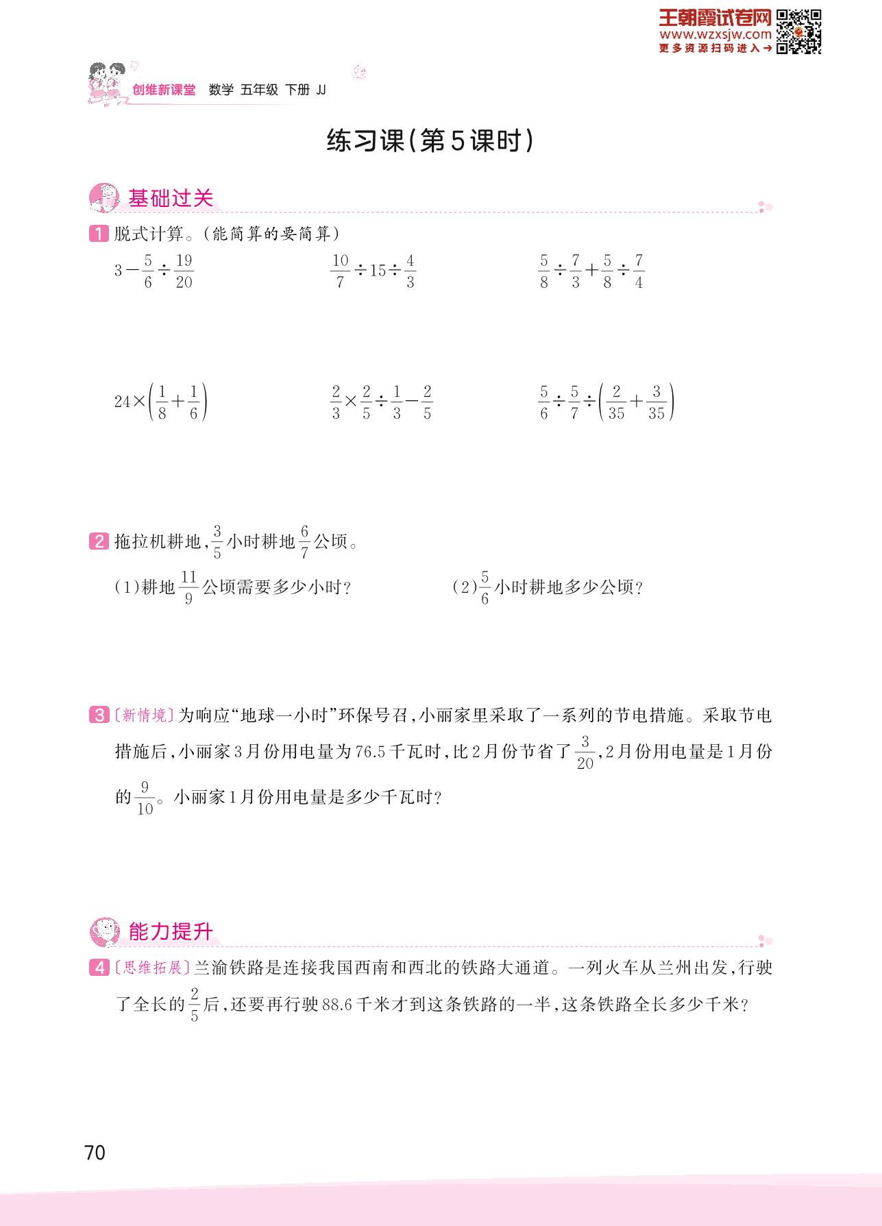 2023下册五年级数学冀教版 六 分数除法——练习课(第5课时)