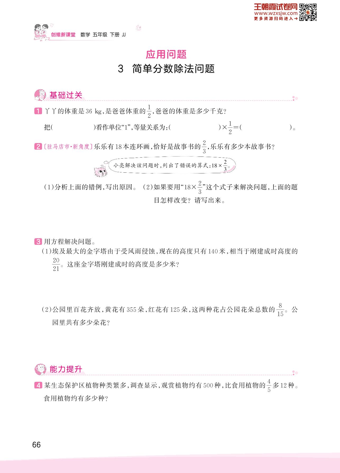 2023下册五年级数学冀教版 六 分数除法——3 简单分数除法问题