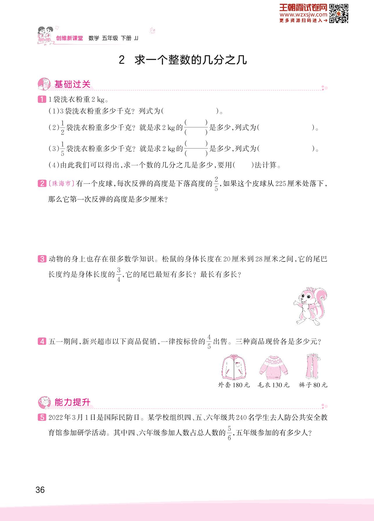 2023下册五年级数学冀教版 四 分数乘法——2 求一个整数的几分之几