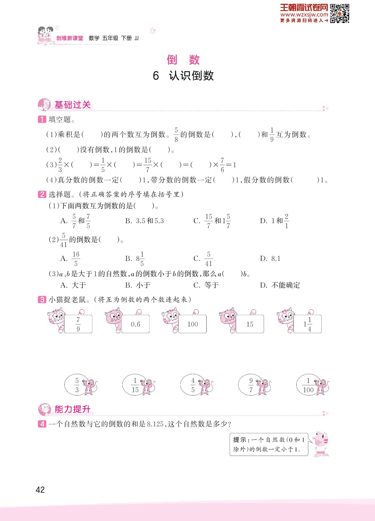 2023下册五年级数学冀教版 四 分数乘法——6 认识倒数