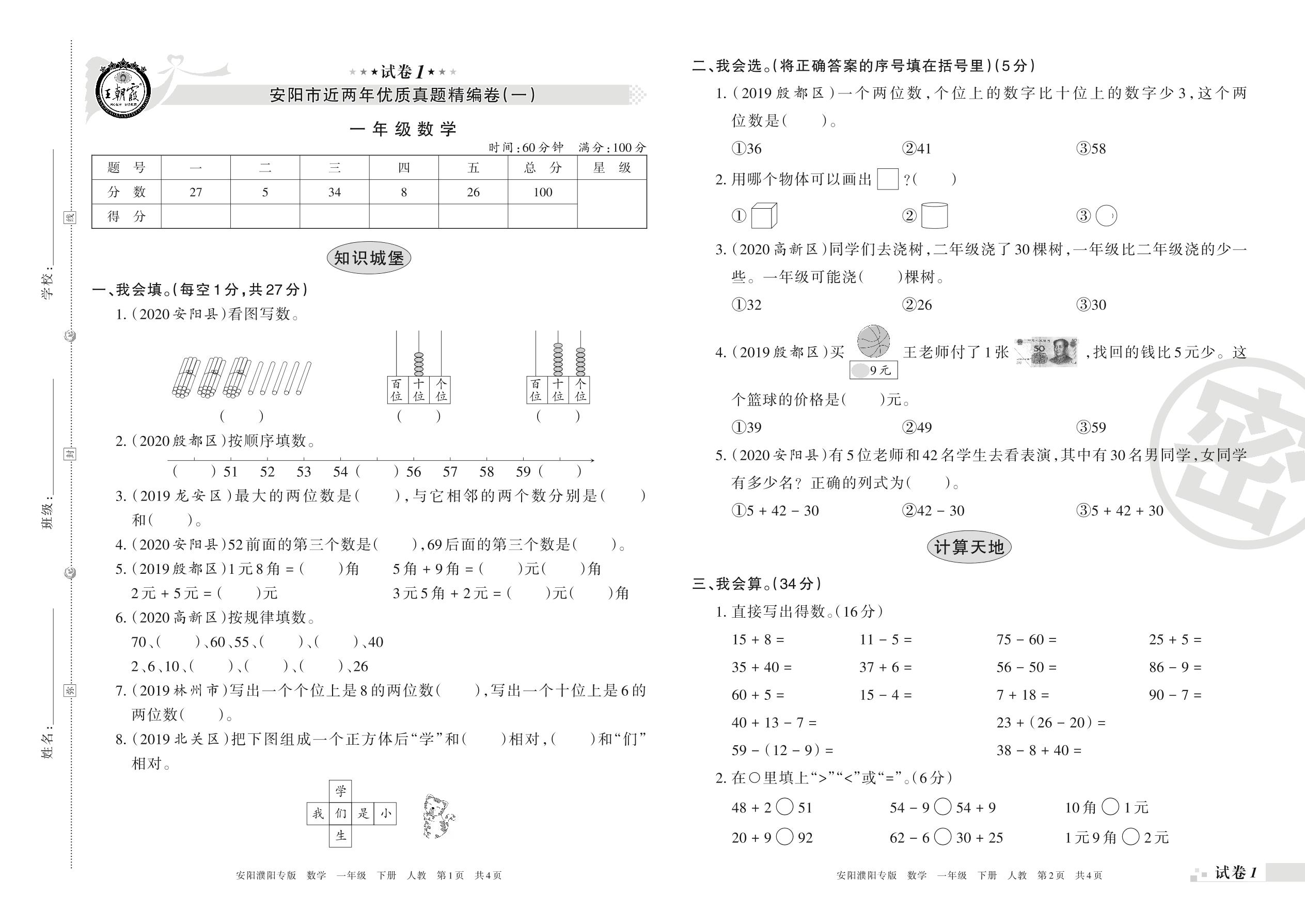 安阳市近两年优质真题精编卷(一)一年级下册数学(人教版)【1】