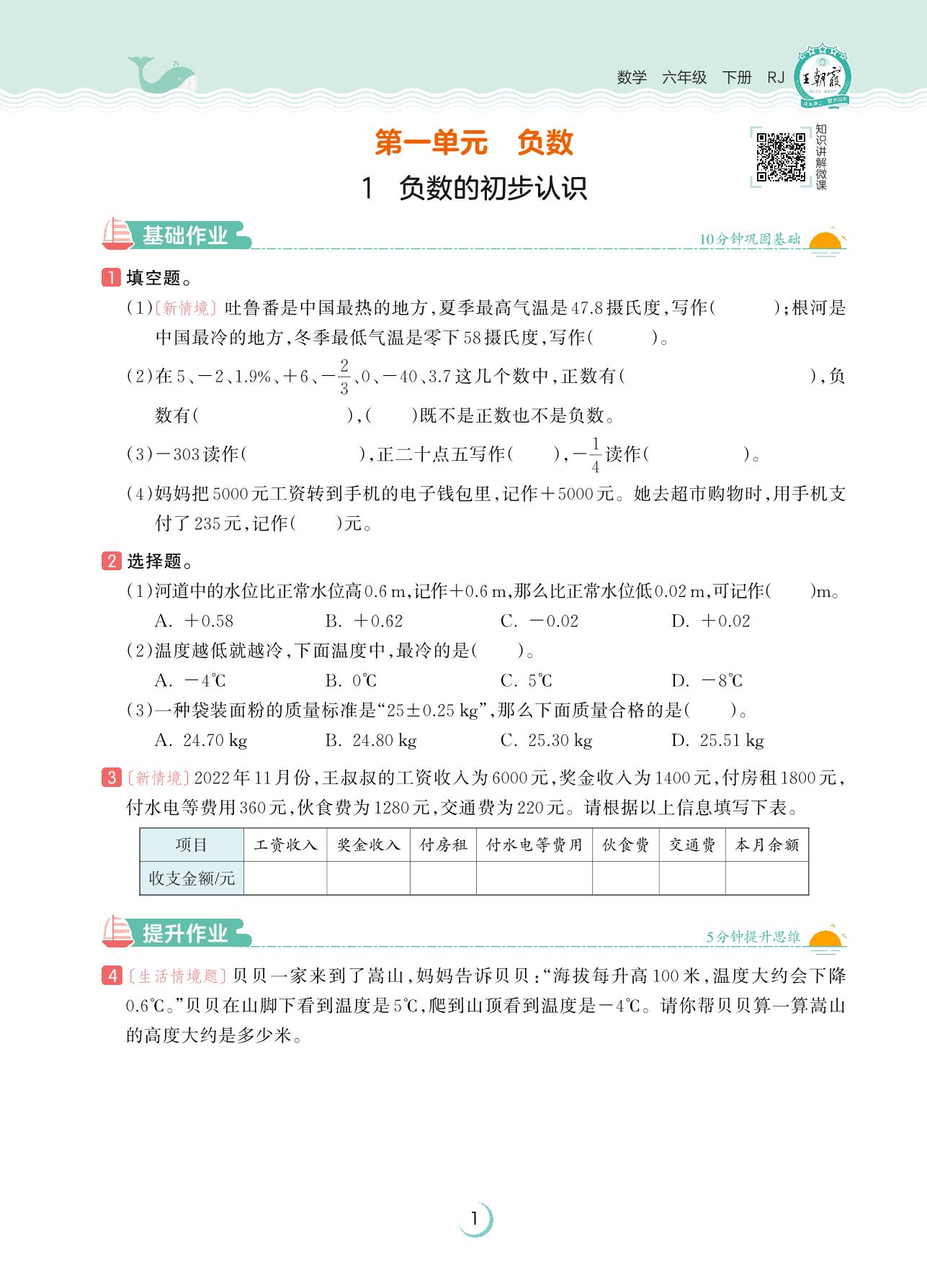 2023下册六年级数学人教版 第一单元 负数——1 负数的初步认识
