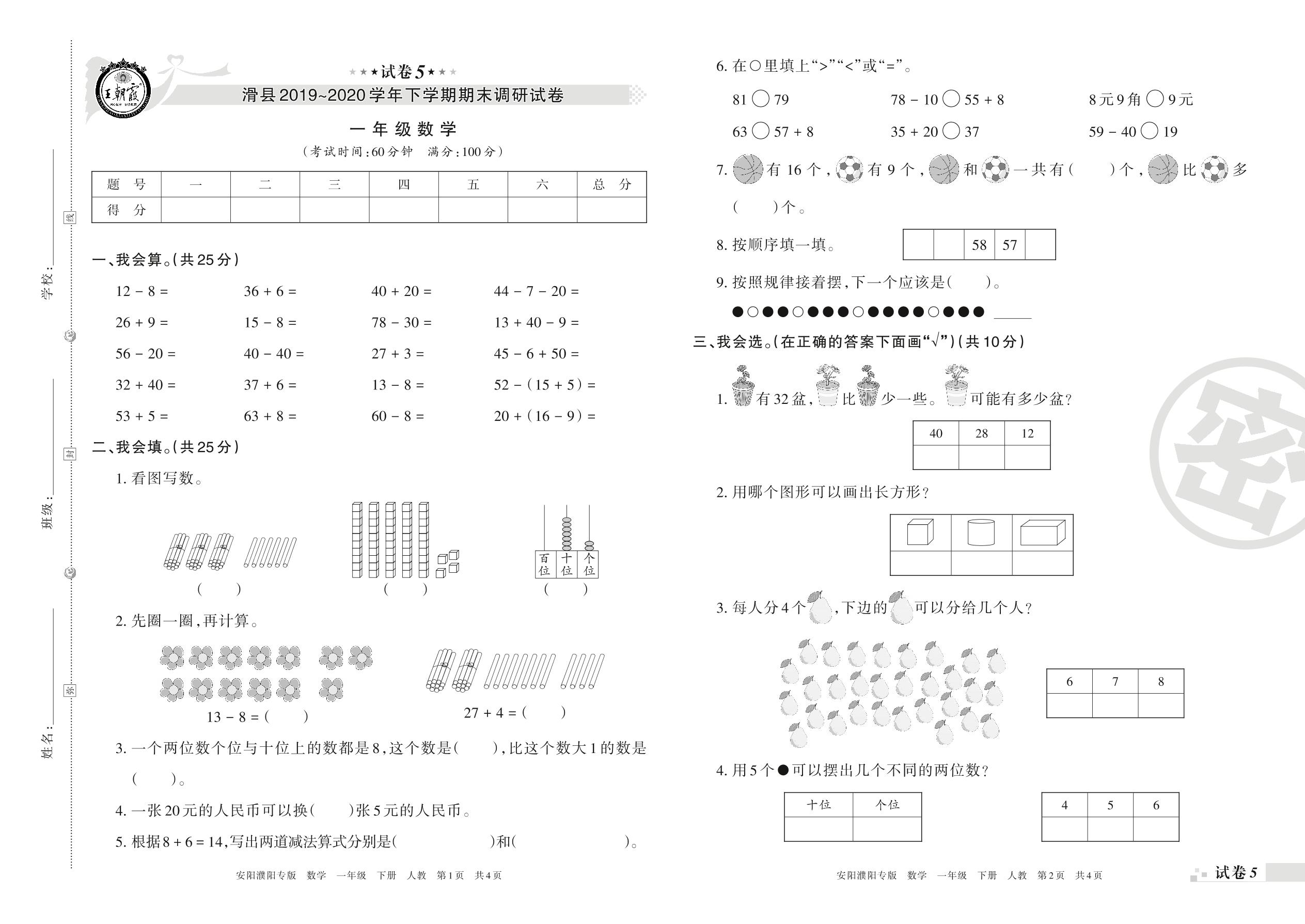 2019-2020学年第二学期安阳市滑县一年级数学试卷(人教版)【5】
