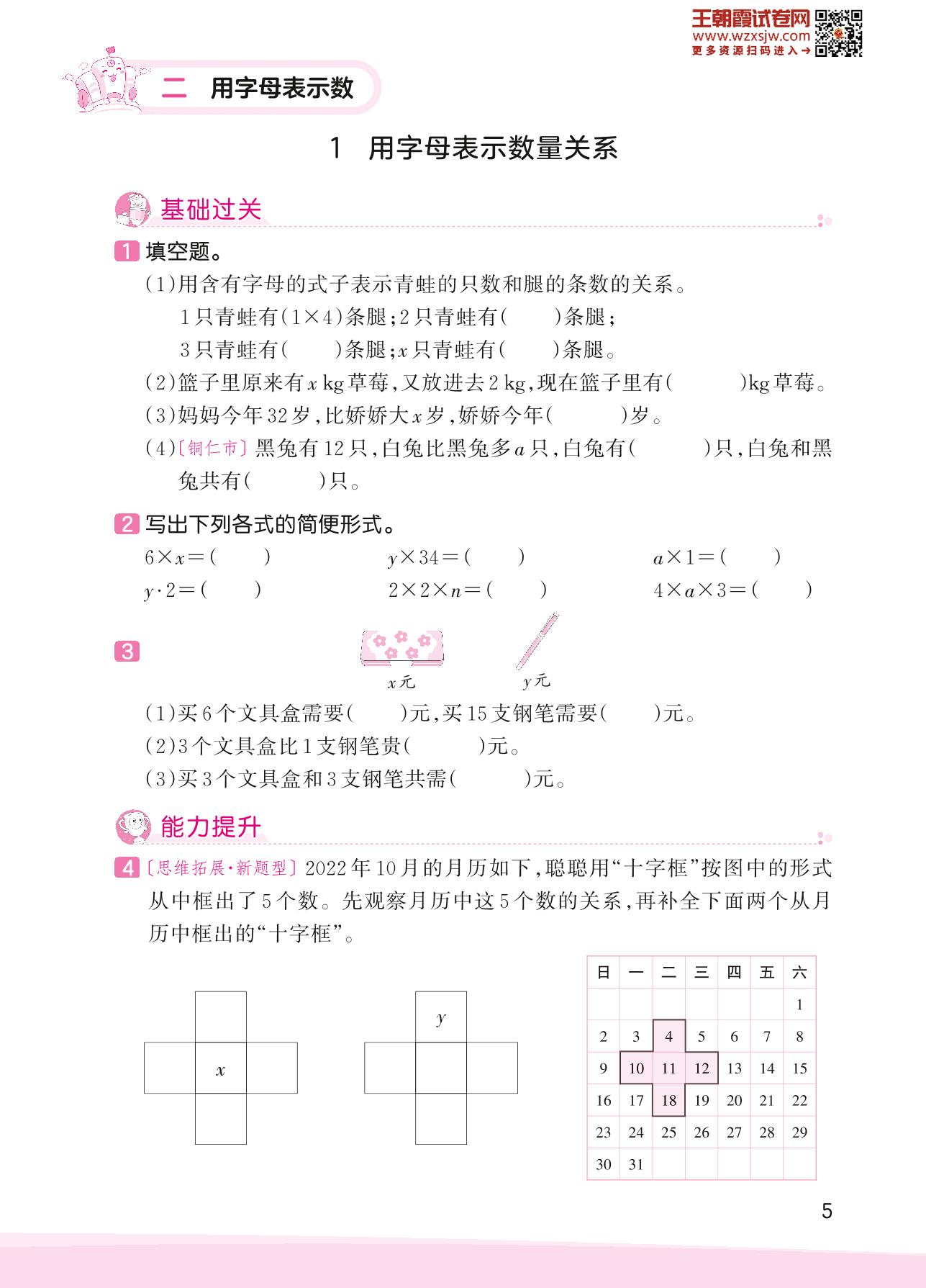 2023下册四年级数学冀教版 二 用字母表示数——1 用字母表示数量关系