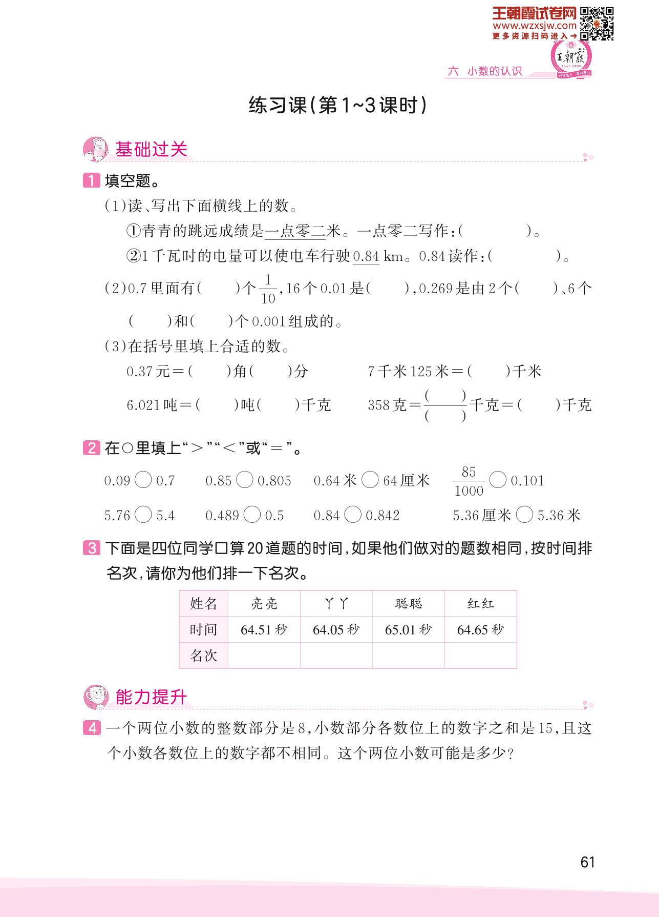 2023下册四年级数学冀教版 六 小数的认识——练习课(第1~3课时)