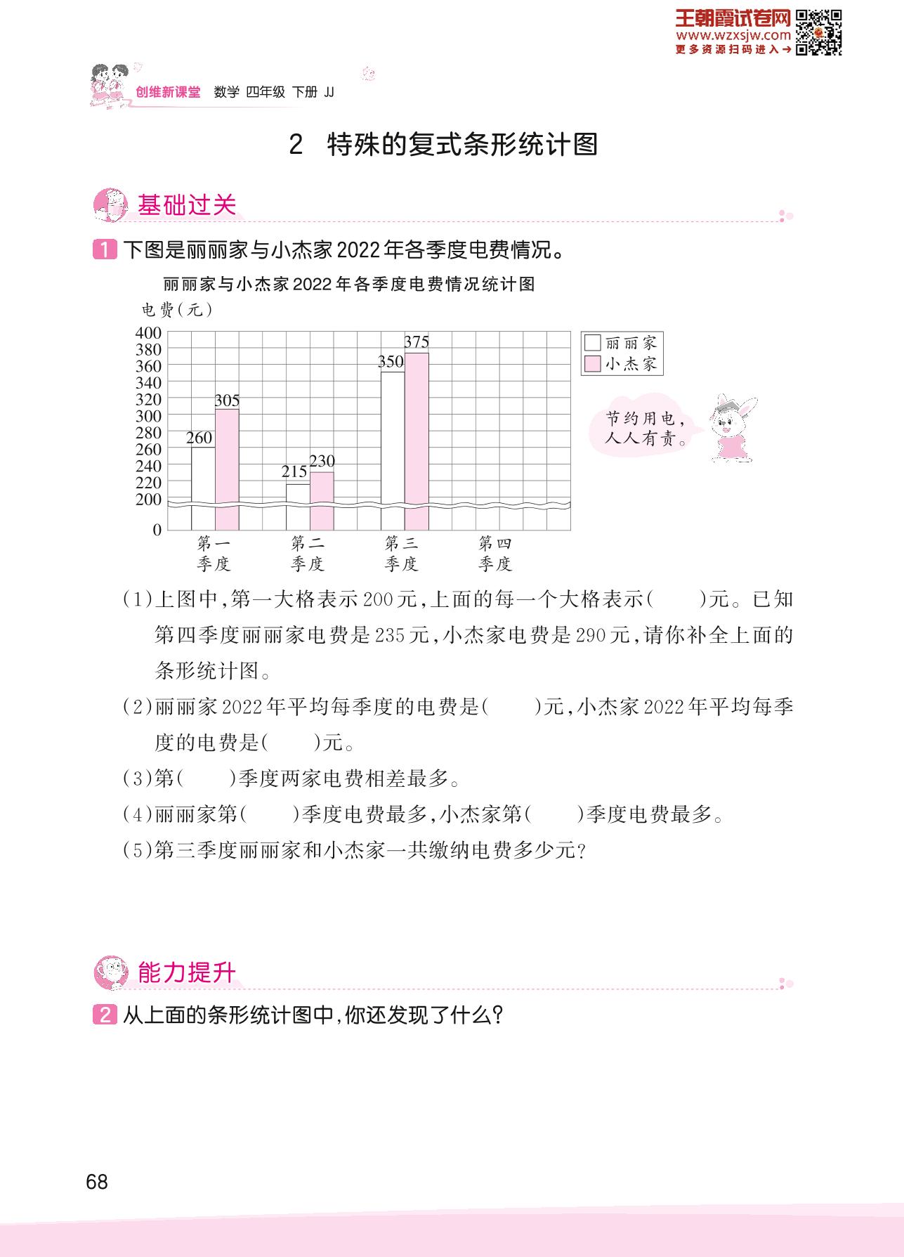 2023下册四年级数学冀教版 七 复式条形统计图——2 特殊的复式条形统计图