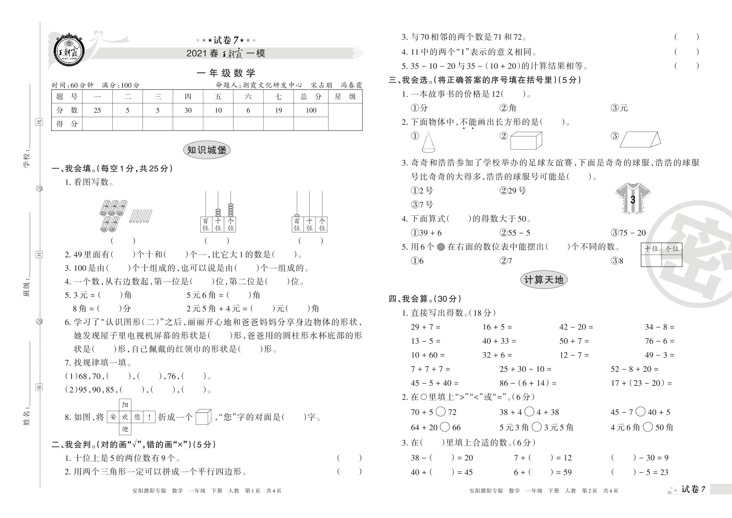 王朝霞期末模拟卷一年级下册数学(人教版)_R210802205511【7】