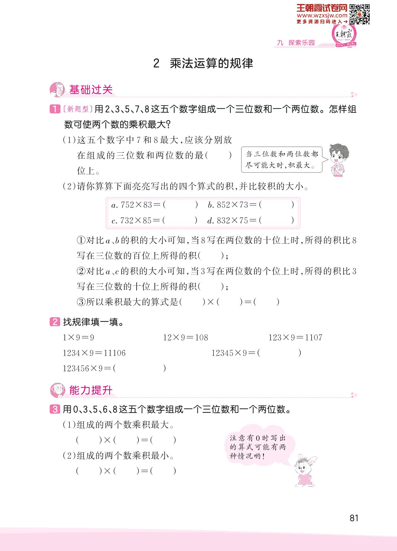 2023下册四年级数学冀教版 九 探索乐园——2 乘法运算的规律