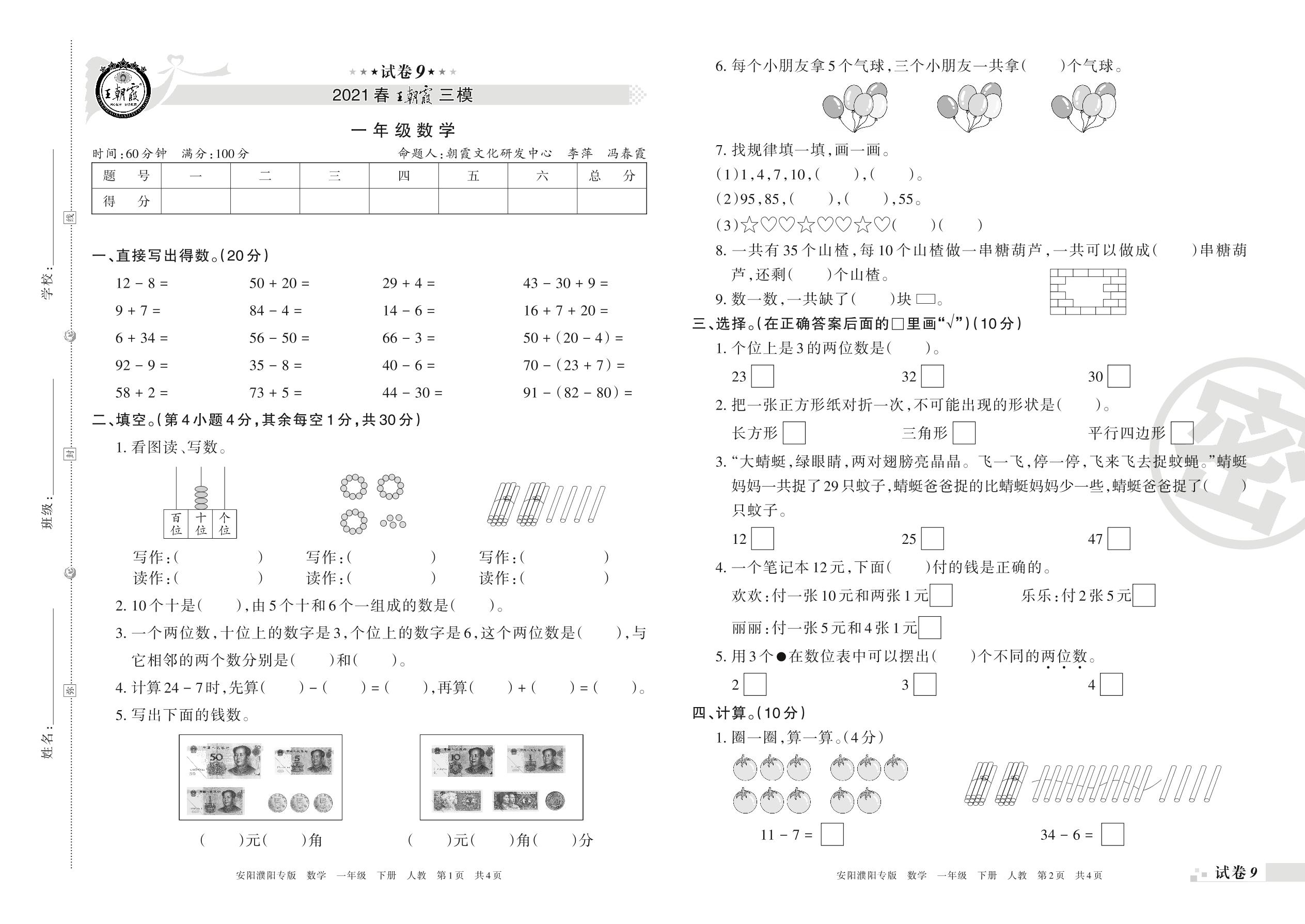 王朝霞期末模拟卷一年级下册数学(人教版)_R210802205517【9】