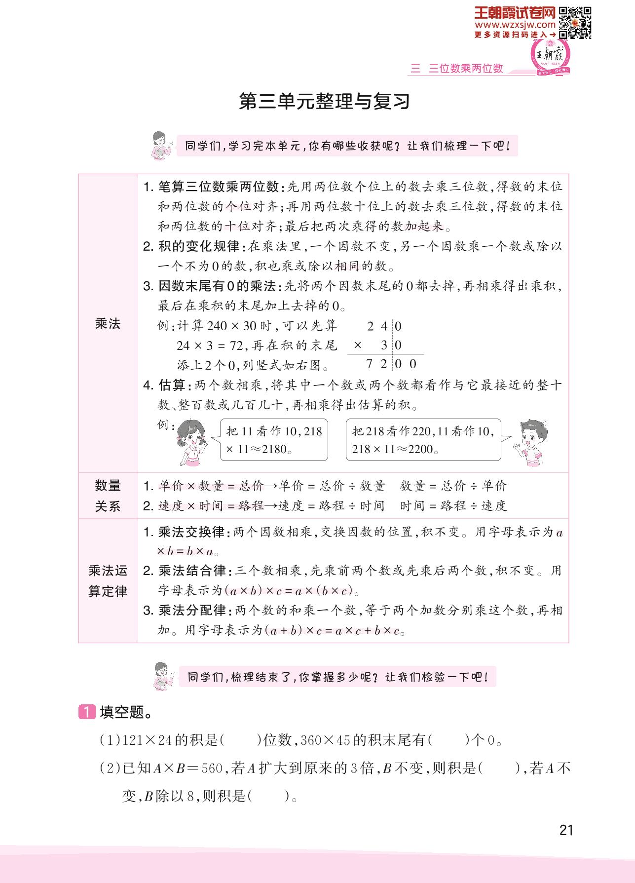 2023下册四年级数学冀教版 第三单元整理与复习