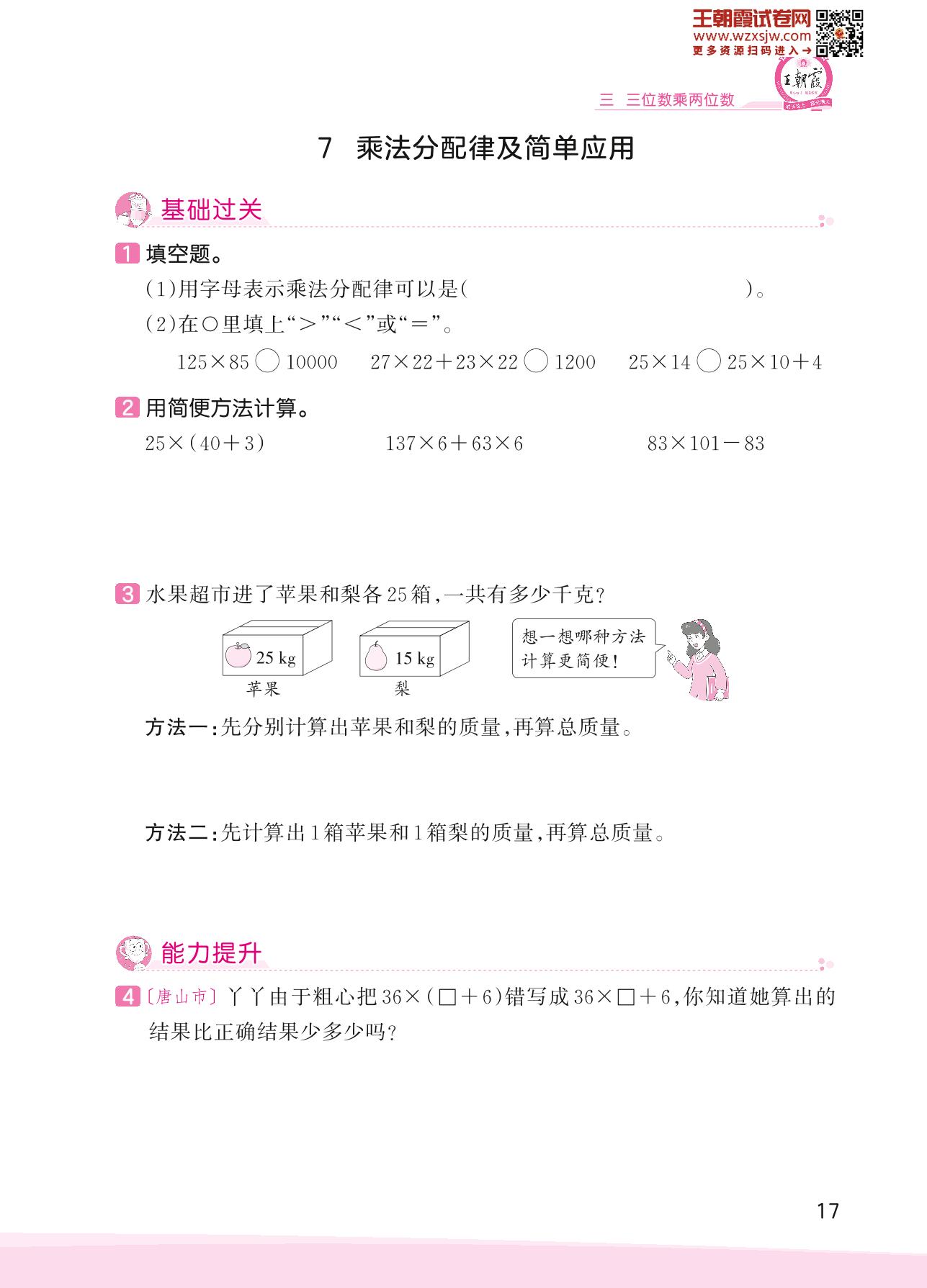 2023下册四年级数学冀教版 三 三位数乘两位数——7 乘法分配律及简单应用