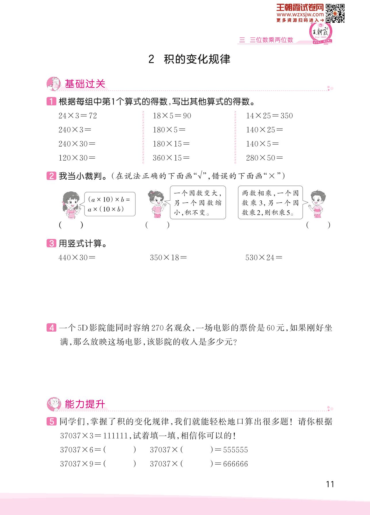 2023下册四年级数学冀教版 三 三位数乘两位数——2 积的变化规律