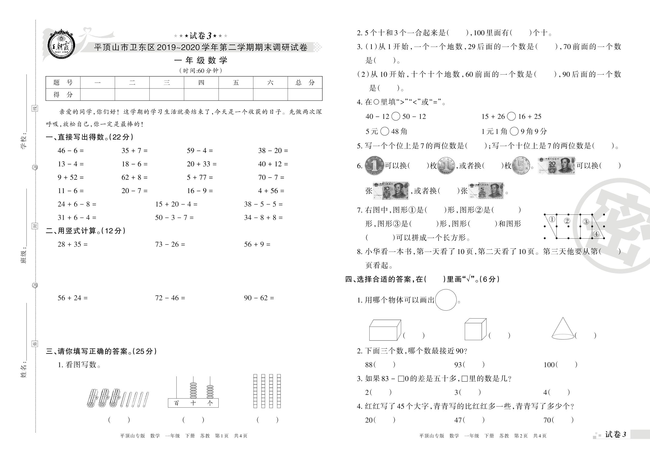2019-2020学年第二学期平顶山市卫东区一年级数学试卷(苏教版)【3】