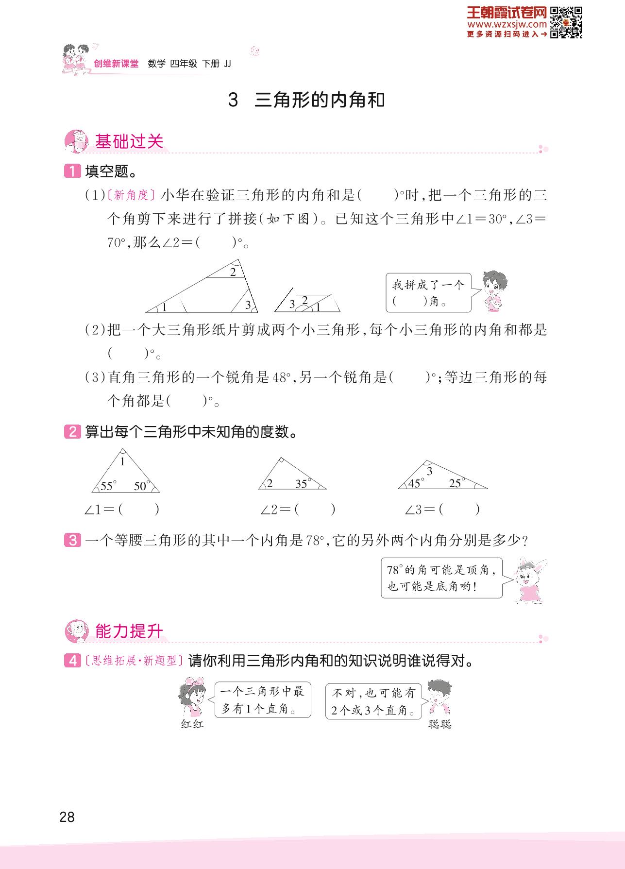 2023下册四年级数学冀教版 四 多边形的认识——3 三角形的内角和