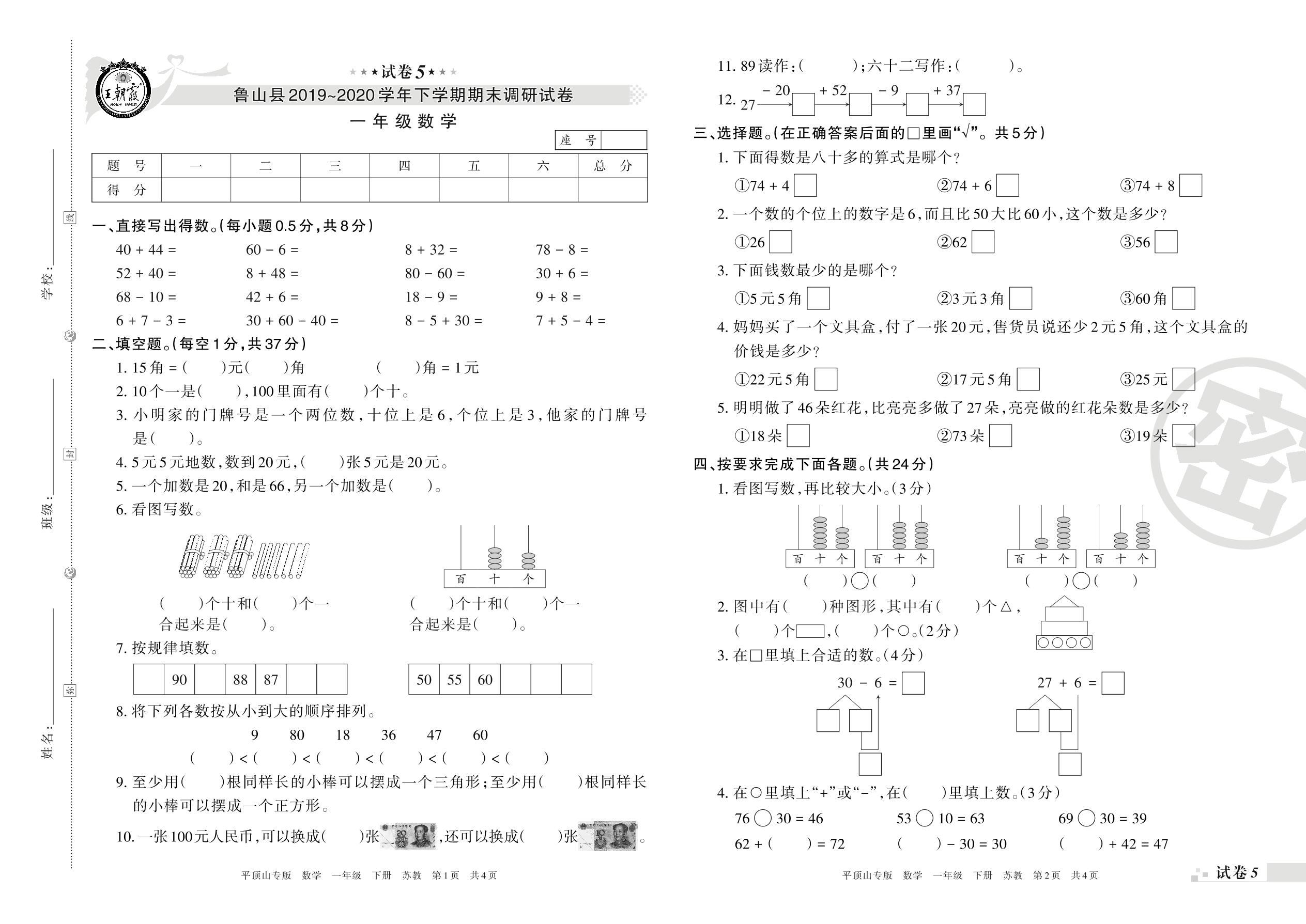 2019-2020学年第二学期平顶山市鲁山县一年级数学试卷(苏教版)【5】