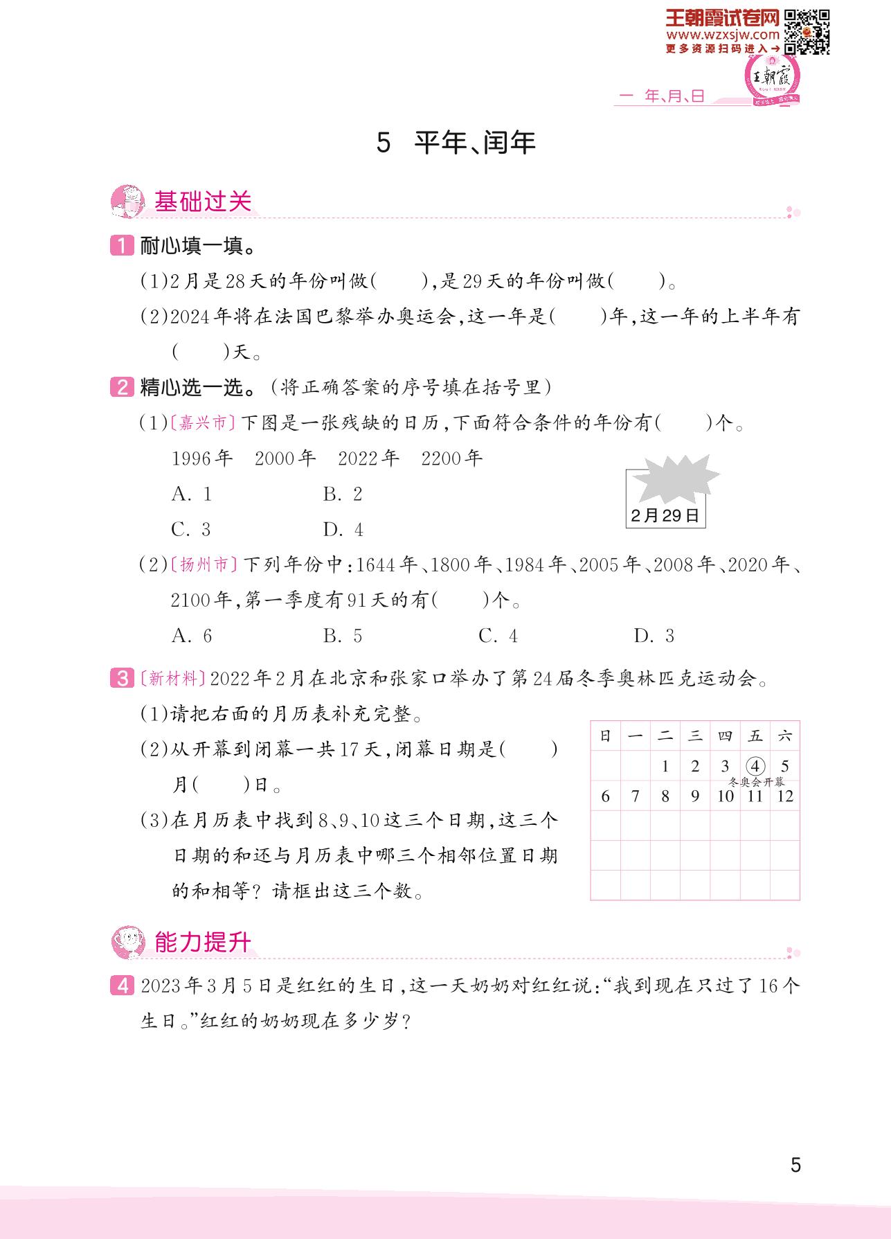2023下册三年级数学冀教版 一 年、月、日——5 平年、闰年