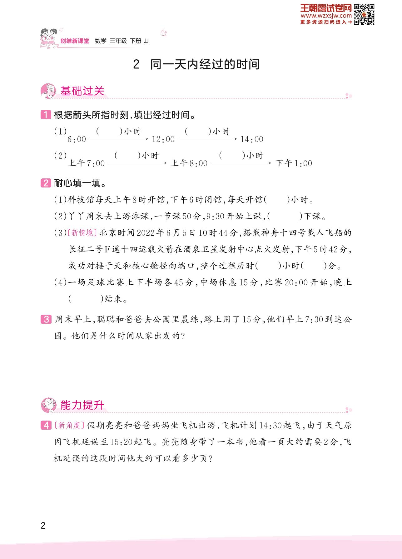 2023下册三年级数学冀教版 一 年、月、日——2 同一天内经过的时间