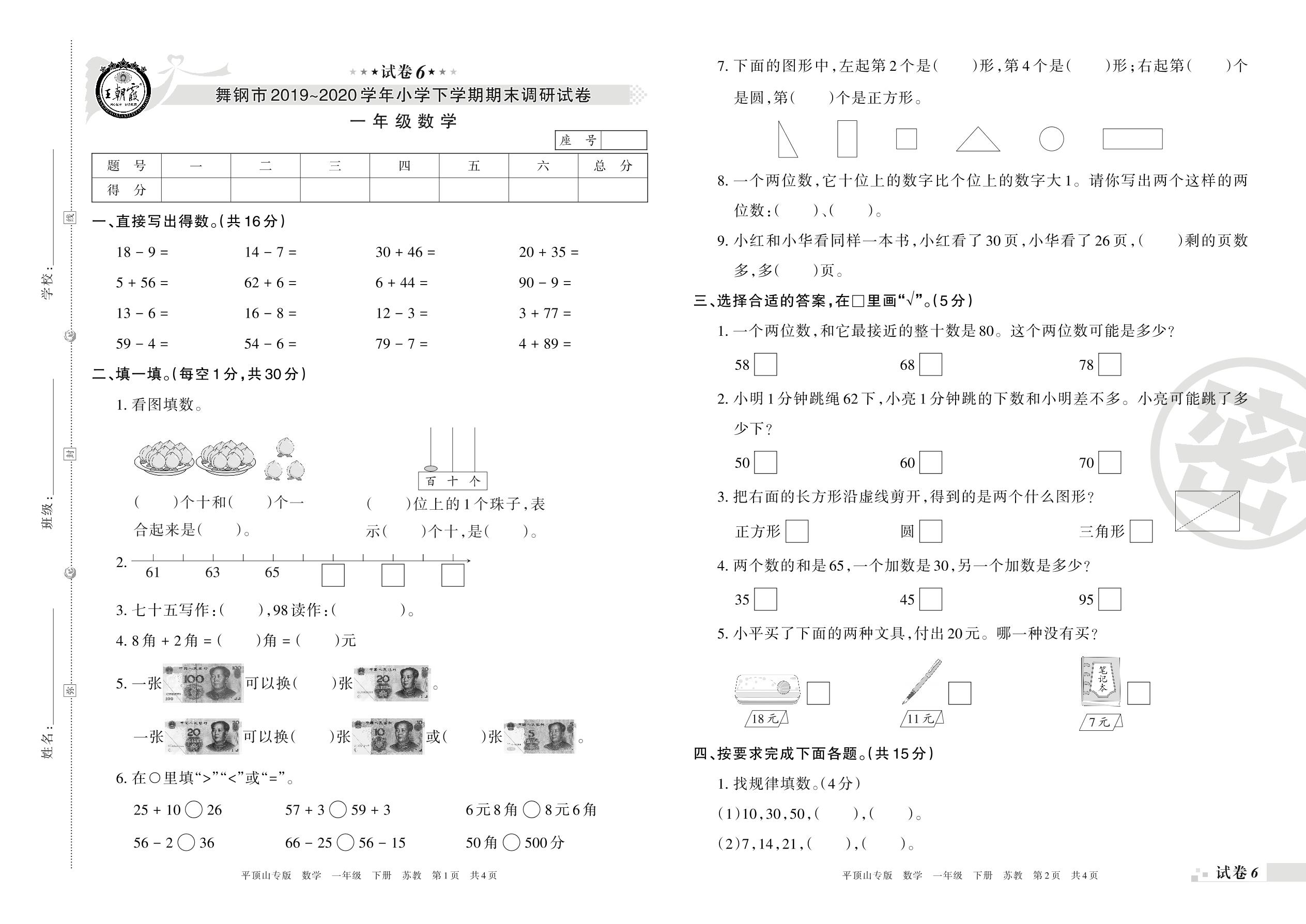 2019-2020学年第二学期舞钢市一年级数学试卷(苏教版)【6】