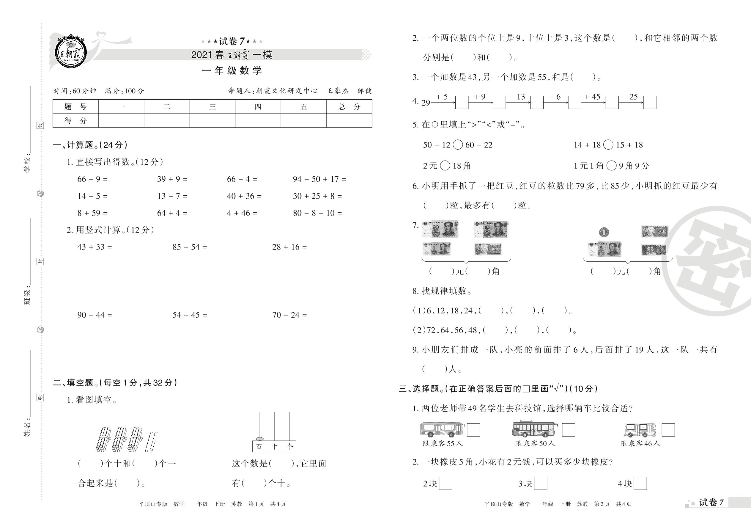 王朝霞期末模拟卷一年级下册数学(苏教版)_R210802205601【7】