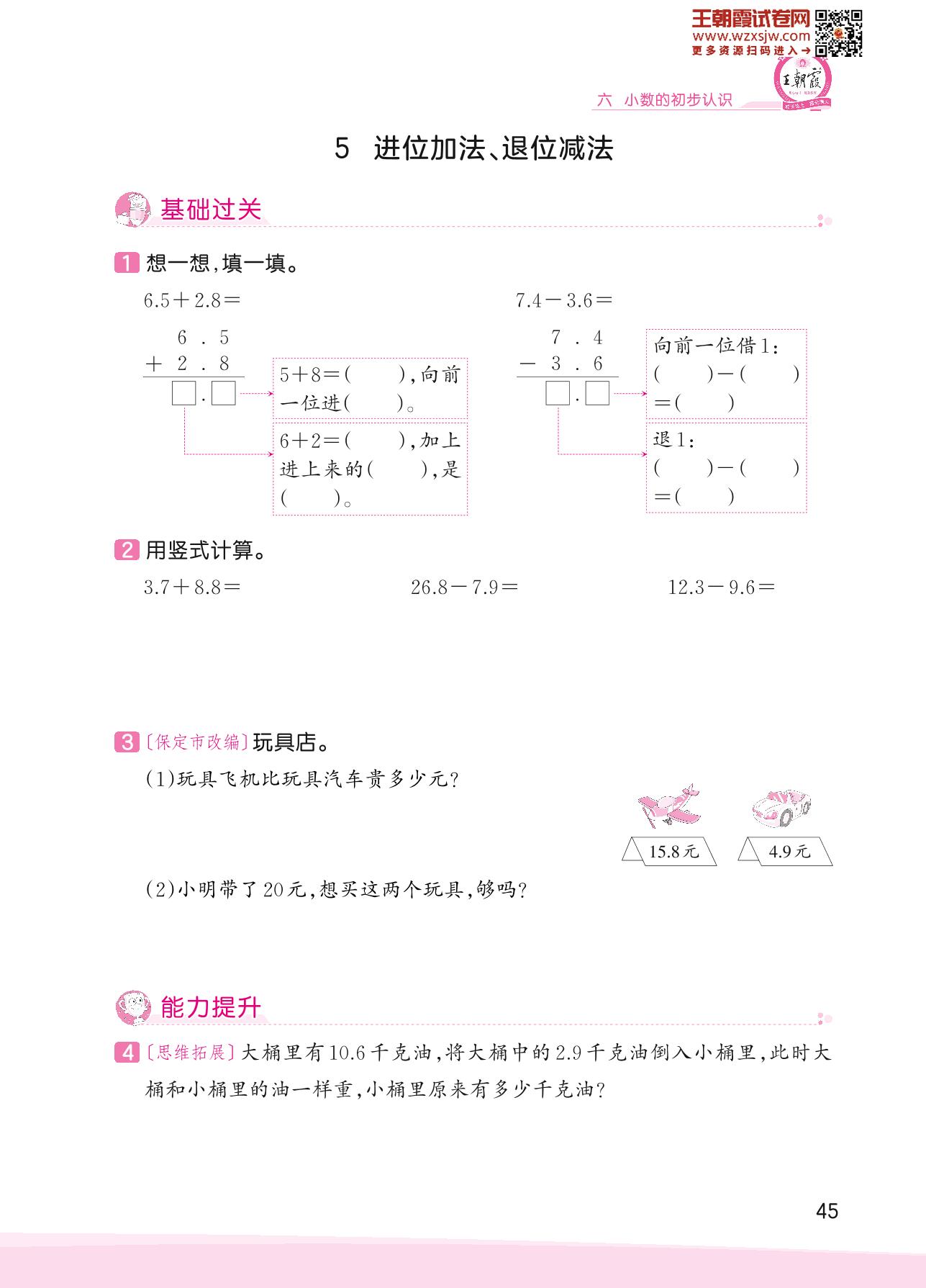 2023下册三年级数学冀教版 六 小数的初步认识——5 进位加法、退位减法