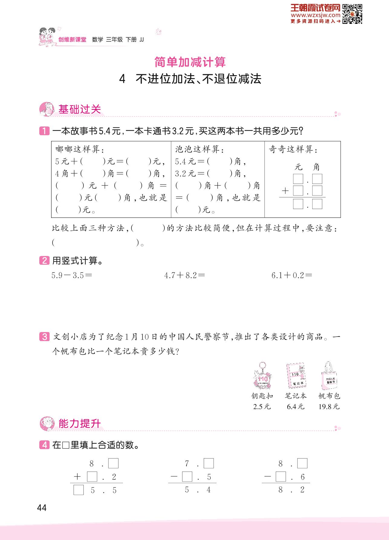 2023下册三年级数学冀教版 六 小数的初步认识——4 不进位加法、不退位减法