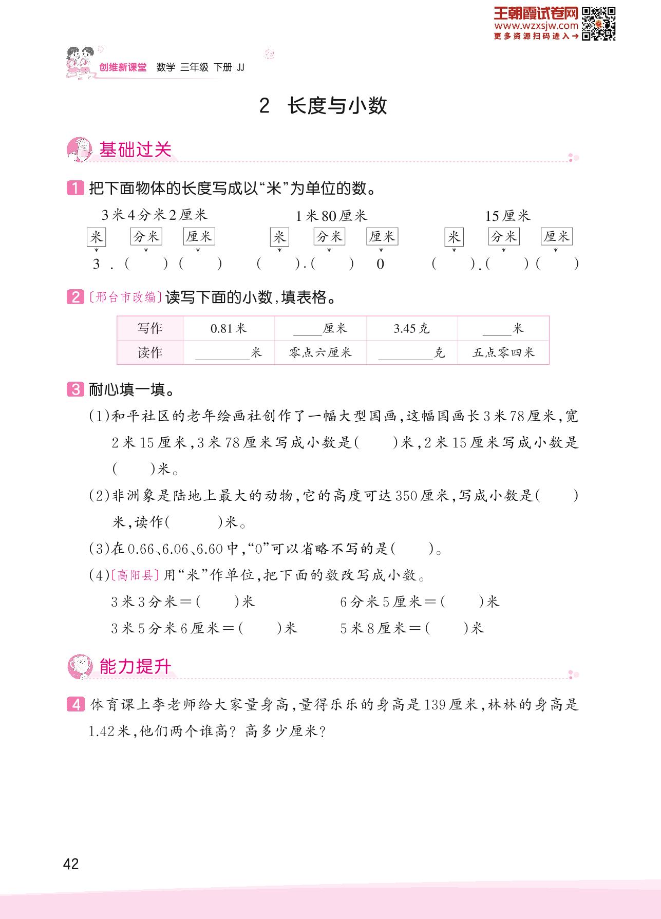 2023下册三年级数学冀教版 六 小数的初步认识——2 长度与小数