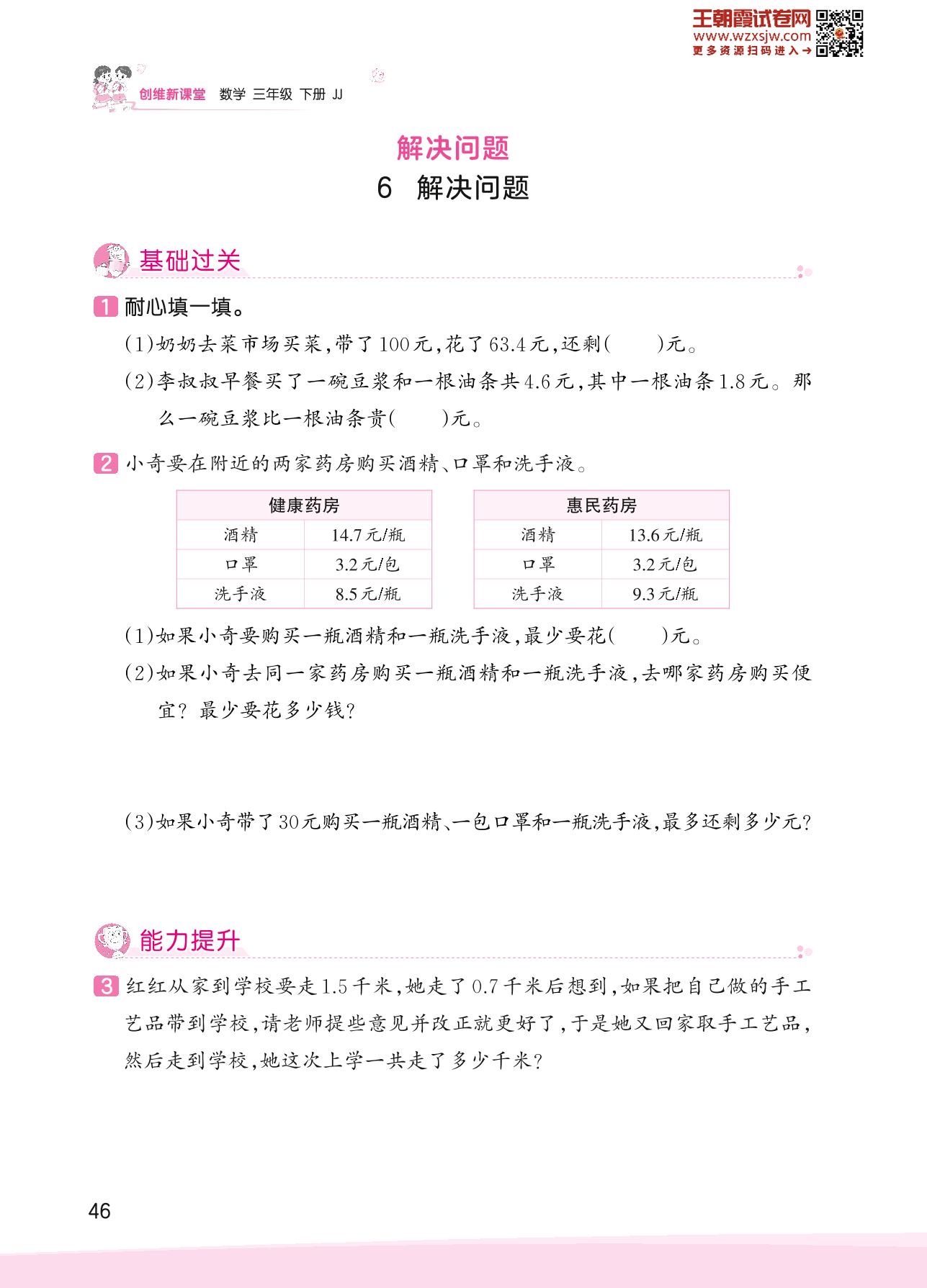 2023下册三年级数学冀教版 六 小数的初步认识——6 解决问题