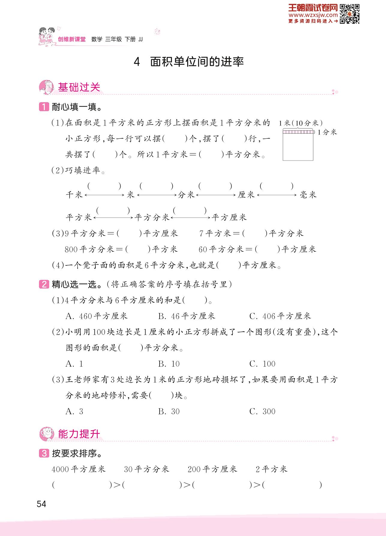 2023下册三年级数学冀教版 七 长方形和正方形的面积——4 面积单位间的进率