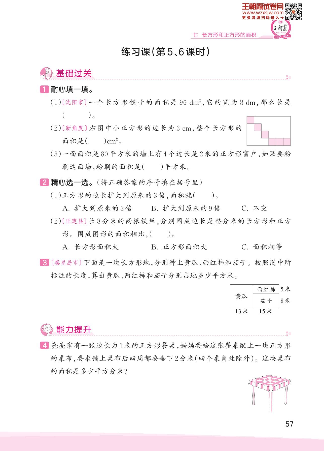2023下册三年级数学冀教版 七 长方形和正方形的面积——练习课(第5、6课时)