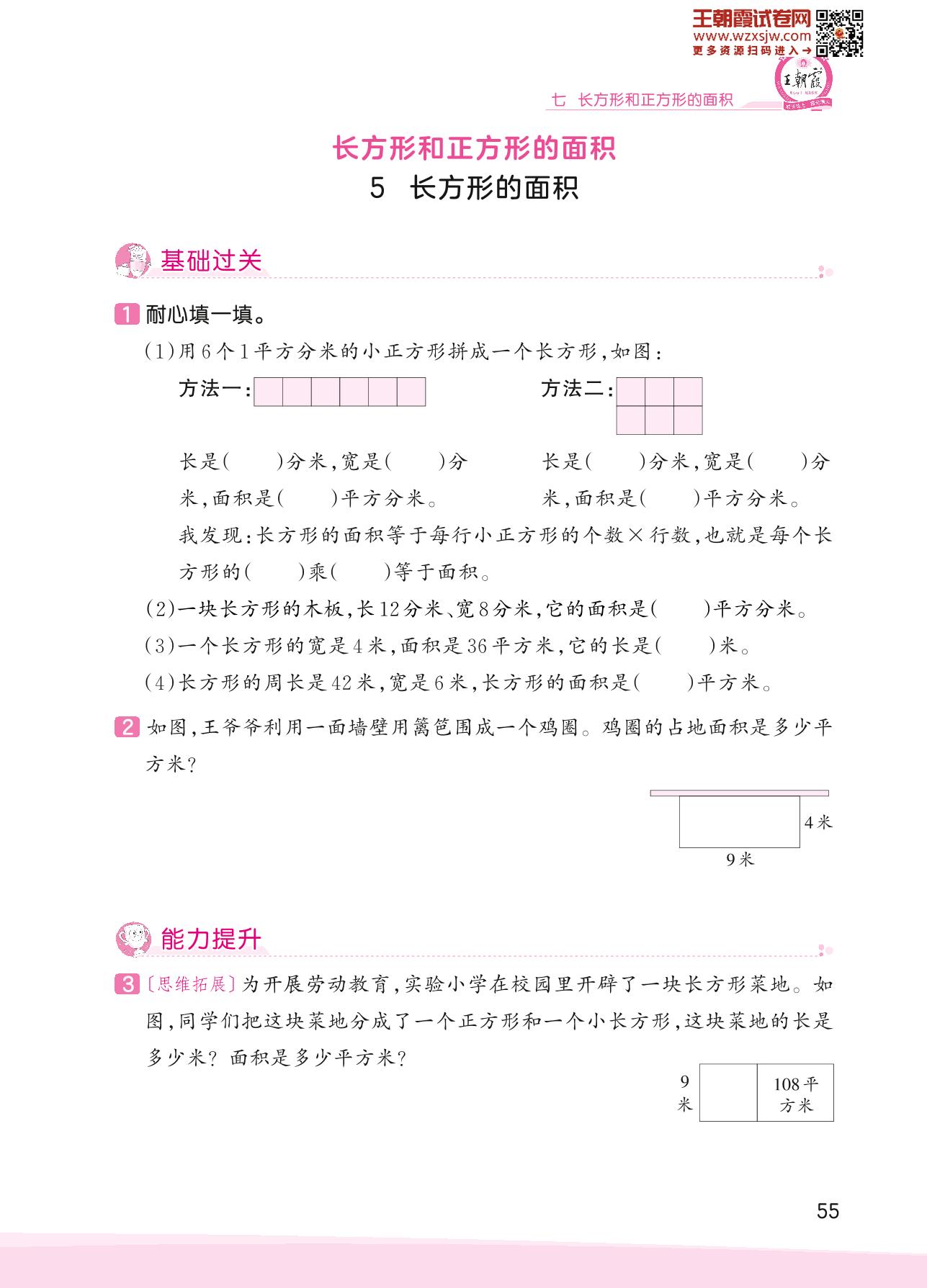 2023下册三年级数学冀教版 七 长方形和正方形的面积——5 长方形的面积