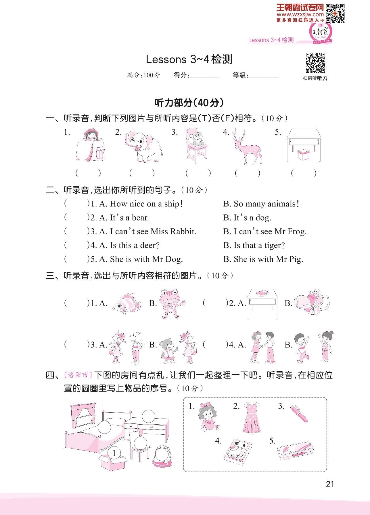 2023下册三年级英语科普版 Lessons 3~4 检测