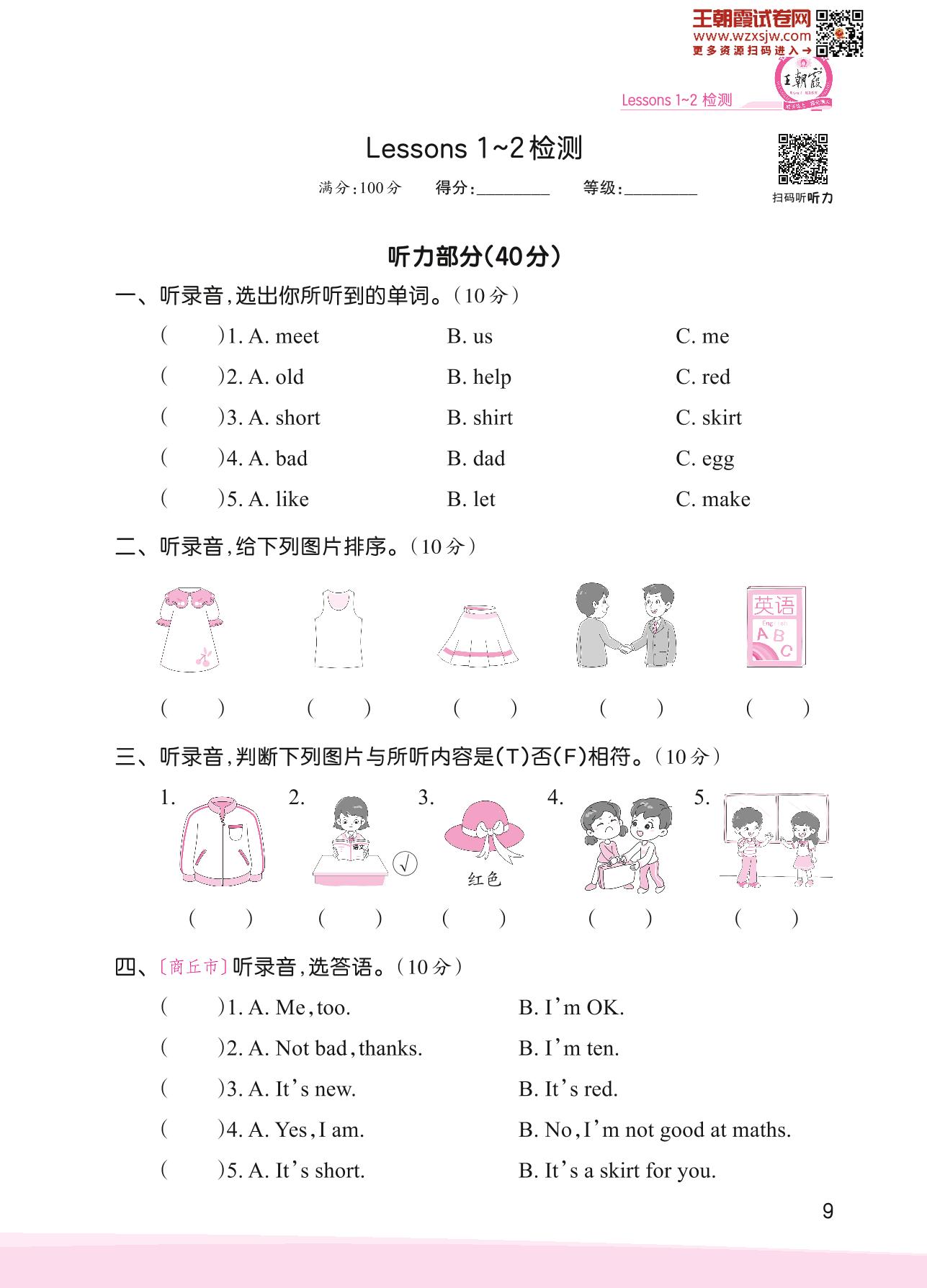 2023下册三年级英语科普版 Lessons 1~2 检测