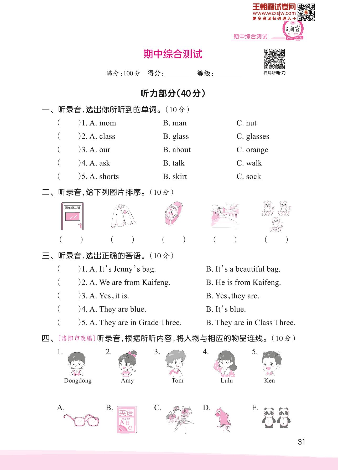 四年级英语科普版下册期中卷
