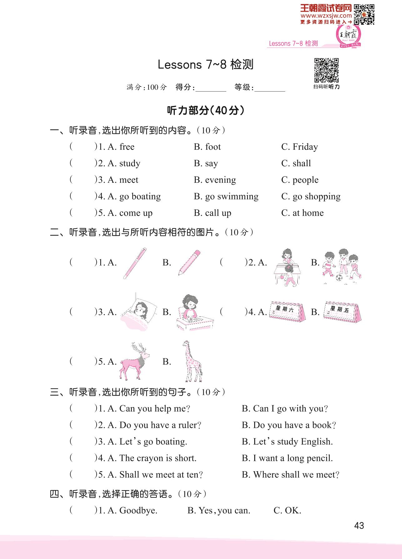 2023下册四年级英语科普版 Lessons 7~8 检测