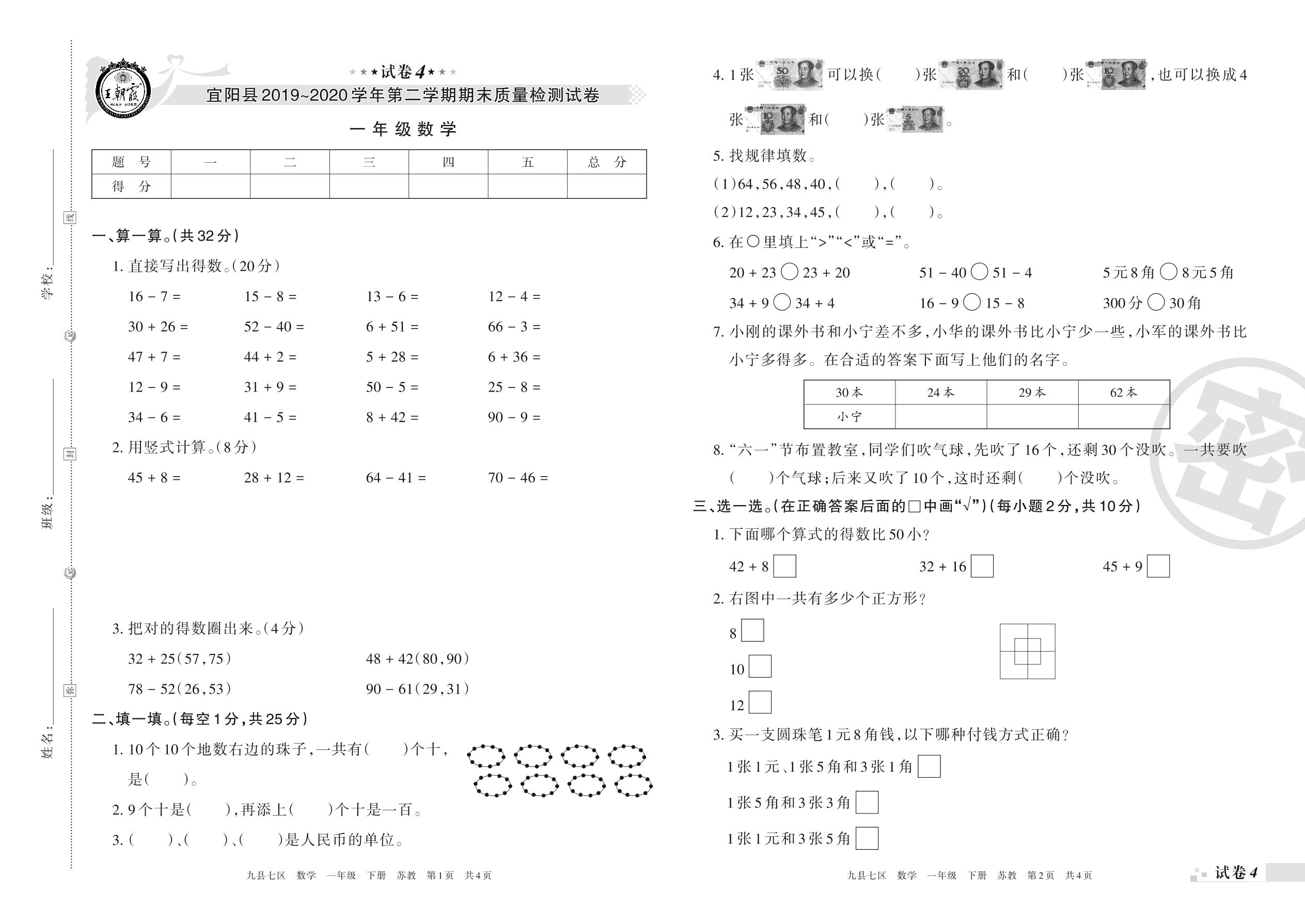 2019-2020学年第二学期洛阳市宜阳县一年级数学试卷(苏教版)【4】