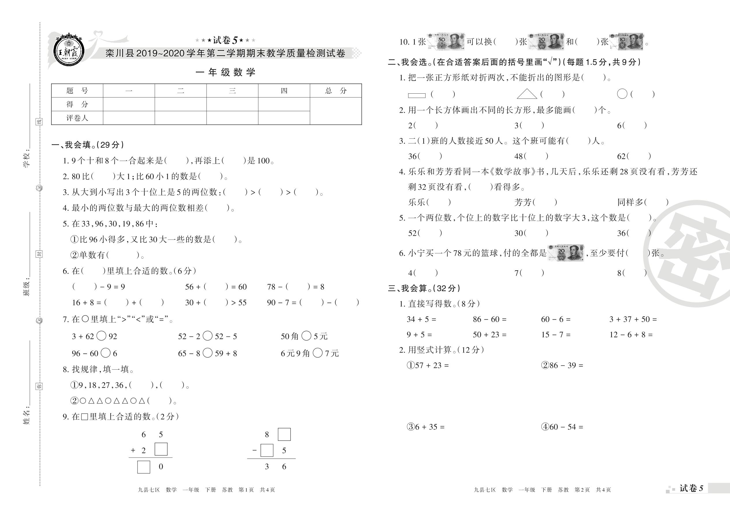2019-2020学年第二学期洛阳市栾川县一年级数学试卷(苏教版)【5】