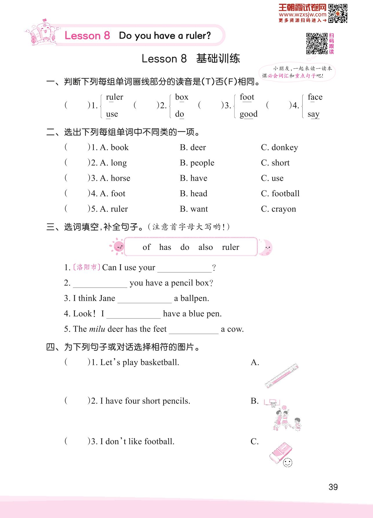 2023下册四年级英语科普版 Lesson 8 基础训练