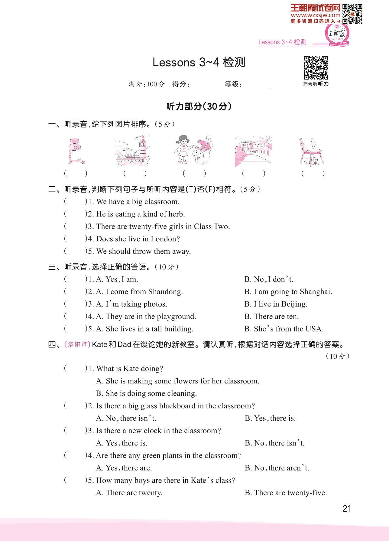2023下册五年级英语科普版 Lessons 3~4 检测
